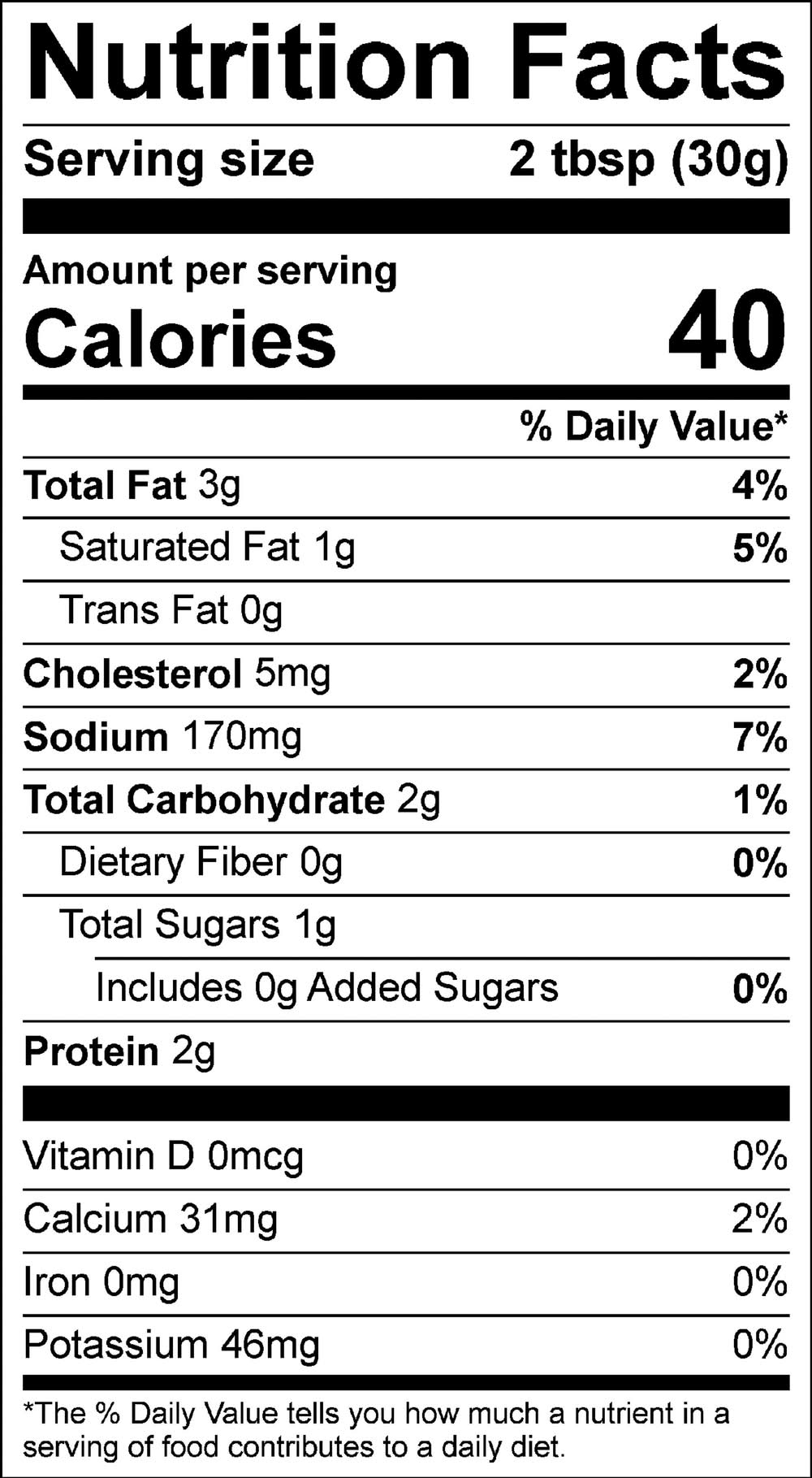 Ingredients: Greek Yogurt (cultured pasteurized grade A milk and cream, pectin), Pickled Cucumber (cucumber, water, salt, distilled vinegar), Feta Cheese (pasteurized milk, salt, cheese cultures, enzymes), Canola Oil, Onions, LESS THAN 2% OF: Dill, Dried Garlic and Onion, Sea Salt, Cane Sugar, Corn Starch, Gum Acacia, Xanthan Gum, Cultured Sugar. CONTAINS: MILK.