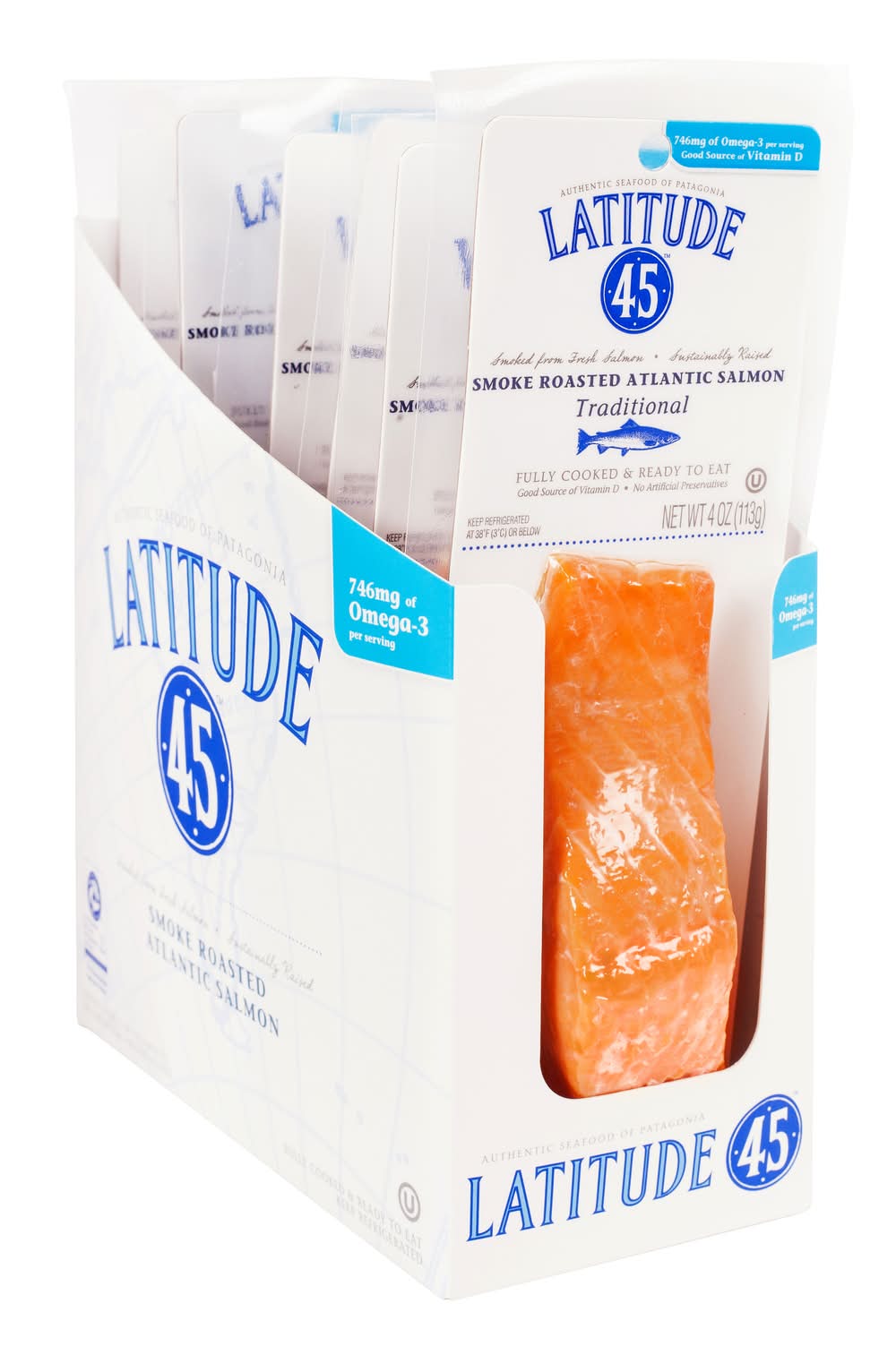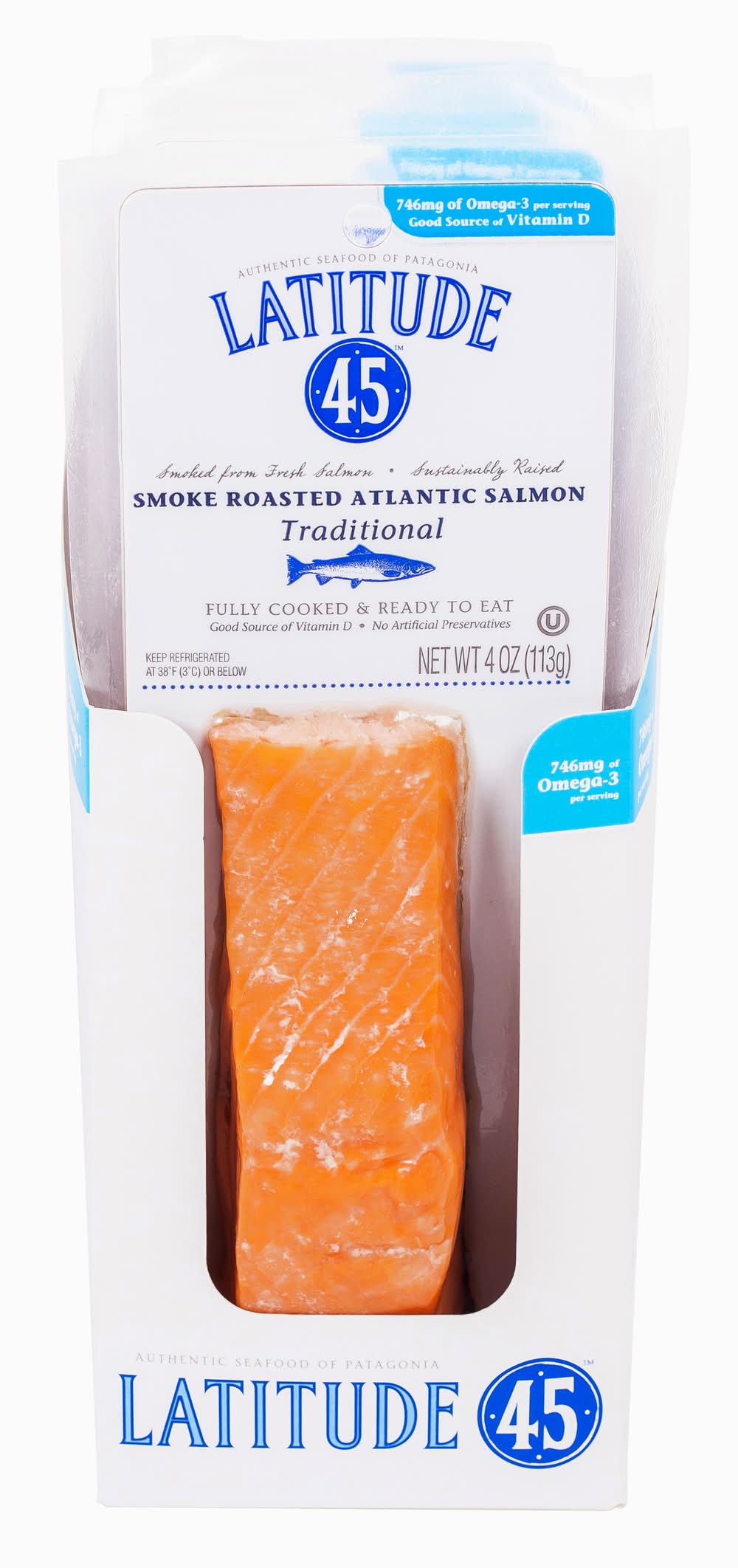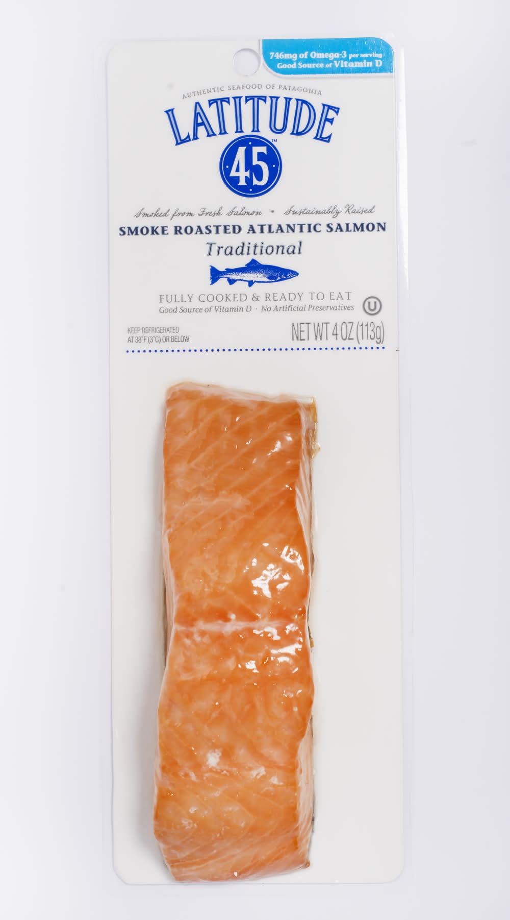 Latitude 45 Hot Smoked Traditional Salmon is smoked from fresh, sustainably raised salmon. This product is fully cooked and ready to eat, requiring refrigeration to maintain its quality.