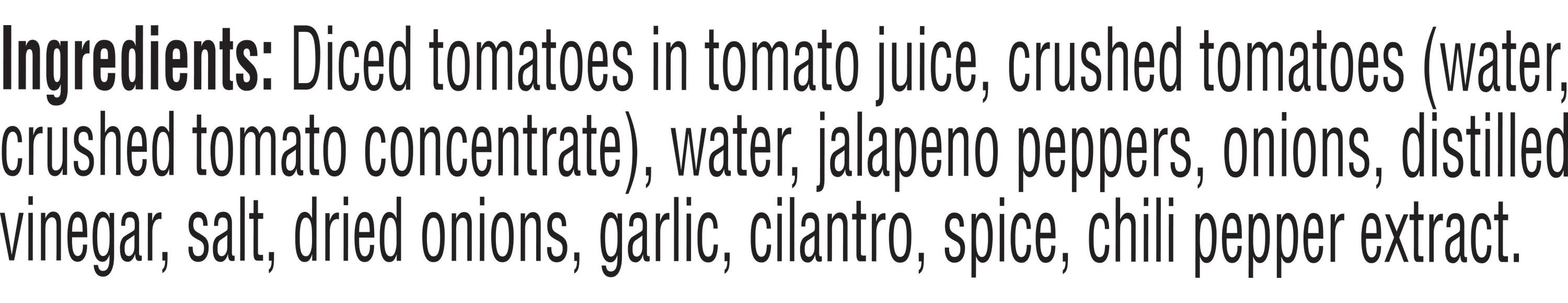 Ingredients: INGREDIENTS: DICED TOMATOES IN TOMATO JUICE, CRUSHED TOMATOES (WATER, CRUSHED TOMATO CONCENTRATE), WATER, JALAPENO PEPPERS, ONIONS, DISTILLED VINEGAR, SALT, DRIED ONIONS, GARLIC, CILANTRO, SPICE, CHILI PEPPER EXTRACT. Contains: 'Gluten Free From'