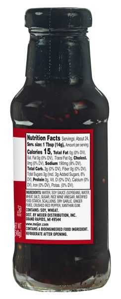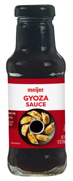 Meijer Gyoza Sauce (12 oz) is a versatile condiment crafted to bring the essence of a beloved Asian restaurant into your kitchen. It includes soy sauce, garlic, and ginger puree, along with crushed red pepper, providing a distinct depth of flavor. This product is suitable for dipping appetizers and can also be used to enhance the taste of vegetables or fried rice. It is additionally ideal for drizzling over lettuce wraps, offering a flavorful addition to a variety of dishes.