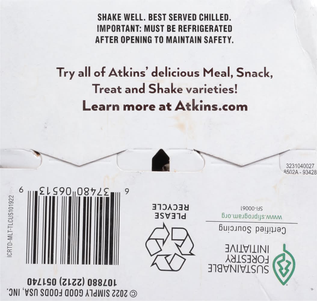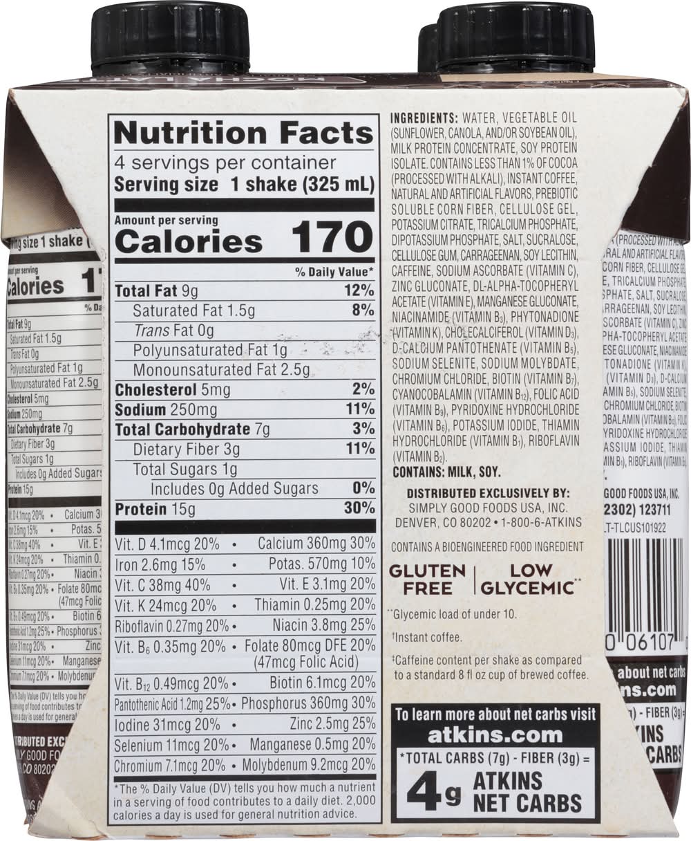 2g Net Carbs. For those watching their carbs, count only 2 grams, as all other carbs are fiber, which have a minimal impact on blood sugar. Naturally and artificially flavored. Atkins Shakes: Get the Advantage! Most shakes have more sugar than a can of soda, and can cause similar quick energy crash. With Atkins Advantage Shakes real, tasty, on-the-go nutrition is always at your fingertips. Grab one as a snack or 60 second meal and you'll be satisfied and hunger-free for hours. The Atkins Difference: Indulgent taste. Only 2 grams of net carbs per can. High in protein. Fortified with essential vitamins & minerals. No hydrogenated oils. No sugar added. Carbs and Your Health: Your body burns carbohydrates and fat for energy. When you load on carbohydrates, you don't give your body much of a chance to burn fat. Even worse, excess carbohydrates can cause your blood sugar to spike, then drop, leaving you tired and craving more food, which can quickly add unwanted pounds. • Flavor: Mocha latte • Pack size: 4 • Packaging: Reusable