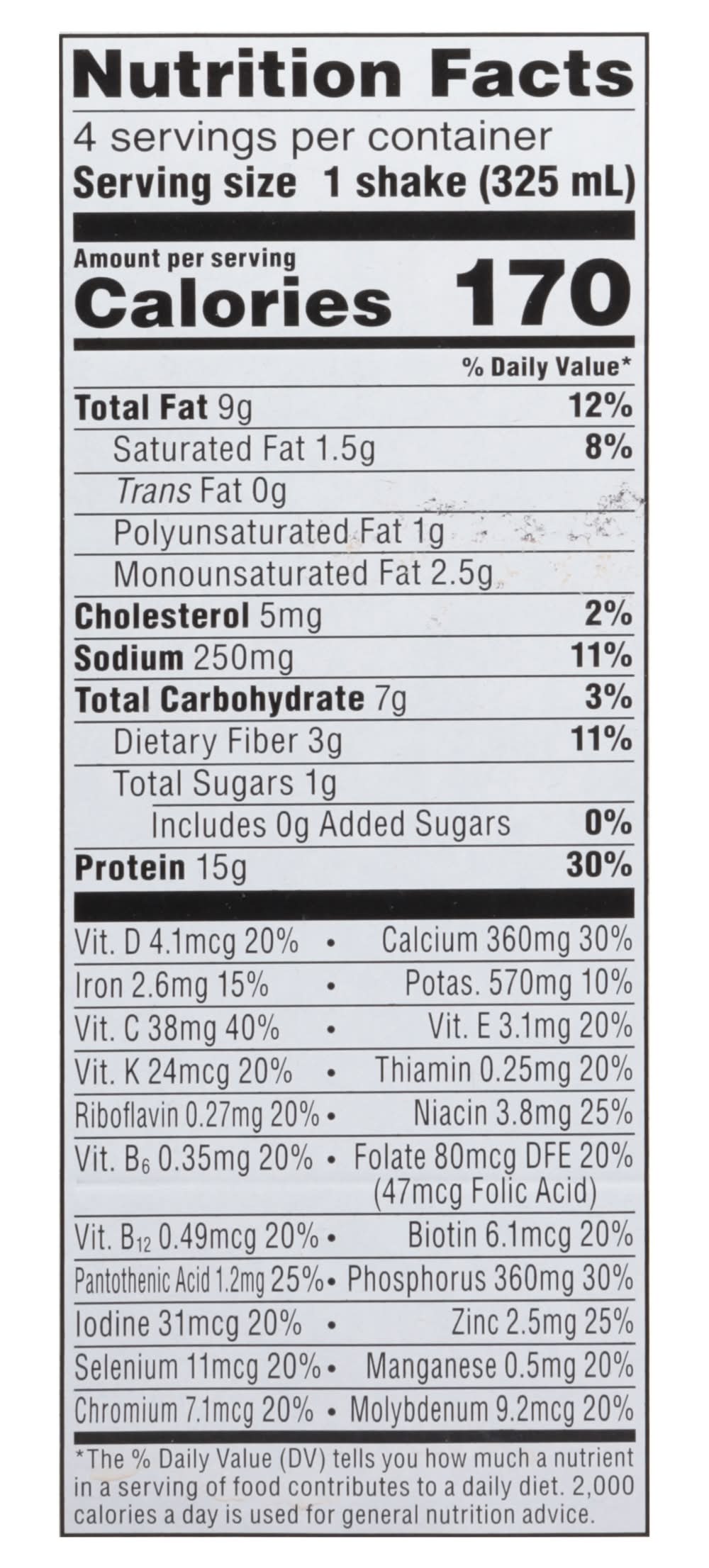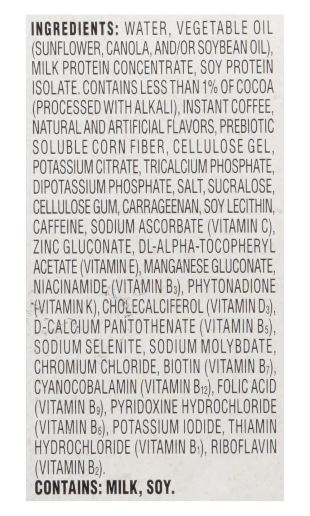 Ingredients: Water, Vegetable Oil (Sunflower, Canola, and/or Soybean Oil), Milk Protein Concentrate, Soy Protein Isolate, Contains Less than 1% of Cocoa (Processed with Alkali), Instant Coffee, Natural and Artificial Flavors, Prebiotic Soluble Corn Fiber, Cellulose Gel, Potassium Citrate, Tricalcium Phosphate, Dipotassium Phosphate, Salt, Sucralose, Cellulose Gum, Carrageenan, Soy Lecithin, Caffeine, Sodium Ascorbate (Vitamin C), Zinc Gluconate, DL-Alpha-Tocopheryl Acetate (Vitamin E), Manganese Gluconate, Niacinamide (Vitamin B3), Phytonadione (Vitamin K), Cholecalciferol (Vitamin D3), D-Calcium Pantothenate (Vitamin B5), Sodium Selenite, Sodium Molybdate, Chromium Chloride, Biotin (Vitamin B7), Cyanocobalamin (Vitamin B12), Folic Acid (Vitamin B9), Pyridoxine Hydrochloride (Vitamin B6), Potassium Iodide, Thiamin Hydrochloride (Vitamin B1), Riboflavin (Vitamin B2) Contains: Milk, Soybeans, Corn