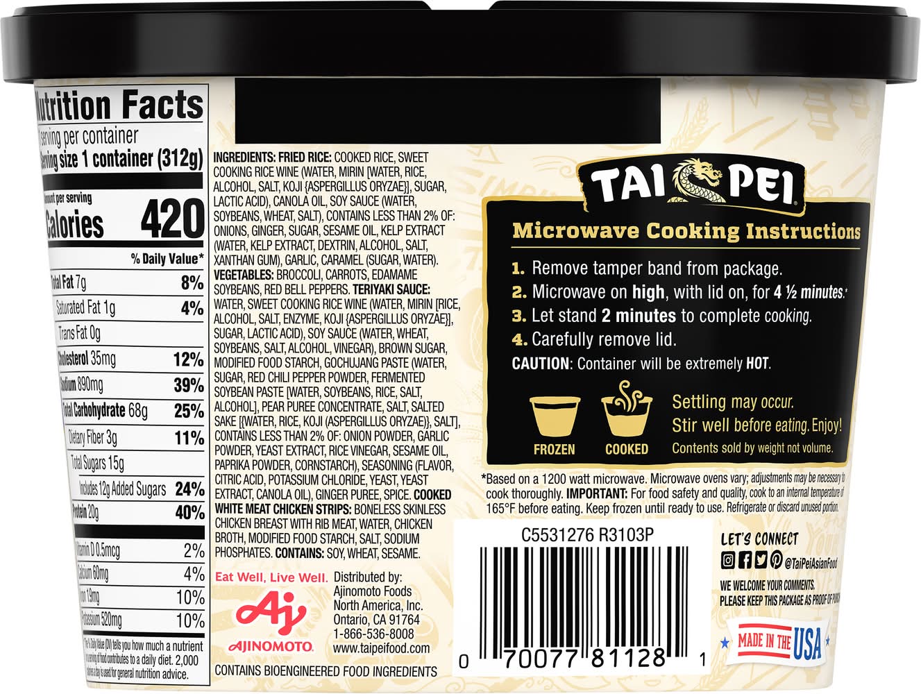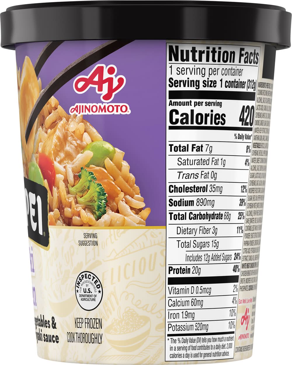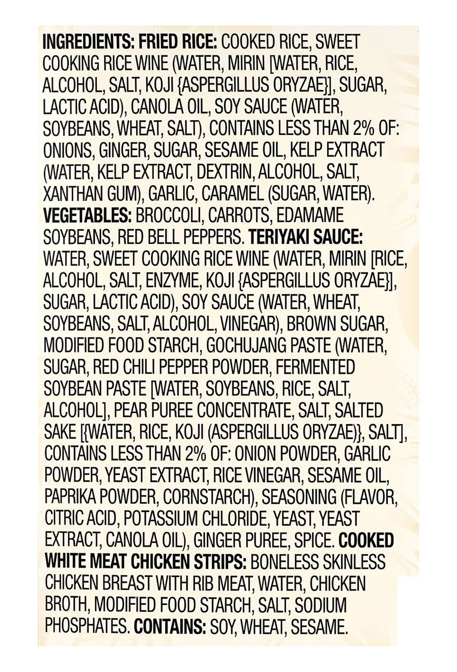 Ingredients: Fried Rice: Cooked Rice, Sweet Cooking Rice Wine (Water, Mirin (Water, Rice, Alcohol, Salt, Koji (Aspergillus Oryzae}], Sugar, Lactic Acid), Canola Oil, Soy Sauce (Water, Soybeans, Wheat, Salt), Contains Less than 2% of: Onions, Ginger, Sugar, Sesame Oil, Kelp Extract (Water, Kelp Extract, Dextrin, Alcohol, Salt, Xanthan Gum), Garlic, Caramel (Sugar, Water). Vegetables: Broccoli, Carrots, Edamame Soybeans, Red Bell Peppers. Teriyaki Sauce: Water, Sweet Cooking Rice Wine (Water, Mirin [Rice, Alcohol, Salt, Enzyme, Koji (Aspergillus Oryzae}], Sugar, Lactic Acid), Soy Sauce (Water, Wheat, Soybeans, Salt, Alcohol, Vinegar), Brown Sugar, Modified Food Starch, Gochujang Paste (Water, Sugar, Red Chili Pepper Powder, Fermented Soybean Paste [Water, Soybeans, Rice, Salt, Alcohol], Pear Puree Concentrate, Salt, Salted Sake [Water, Rice, Koji (Aspergillus Oryzae)}, Salt], Contains Less than 2% of: Onion Powder, Garlic Powder, Yeast Extract, Rice Vinegar, Sesame Oil, Paprika Powder, Cornstarch), Seasoning (Flavor, Citric Acid, Potassium Chloride, Yeast, Yeast Extract, Canola Oil), Ginger Puree, Spice. Cooked White Meat Chicken Strips: Boneless Skinless Chicken Breast with Rib Meat, Water, Chicken Broth, Modified Food Starch, Salt, Sodium Phosphates Contains: Soybeans, Wheat