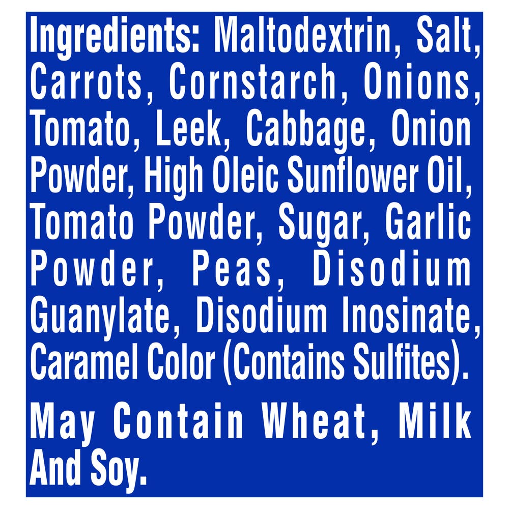 Ingredients: Carrots Dehydrated, Salt, Cabbage Dehydrated, Corn Starch, Onions Dehydrated, Corn Syrup Dehydrated, Leek Dehydrated, Yeast Extract, Peas Dehydrated, Sugar, Green Bell Peppers Dehydrated, Red Bell Peppers Dehydrated, Tomato Dehydrated, Maltodextrin Corn, Potato, Chicken Fat, Onion Powder, Sodium Citrate, Natural Flavor, Soy Sauce Fermented Soybeans, Wheat and Salt, Disodium Guanylate, Disodium Inosinate, Garlic Powder, Hydrolyzed Vegetable Protein Corn, Soy, Wheat. Contains: Soybeans, Wheat, Milk