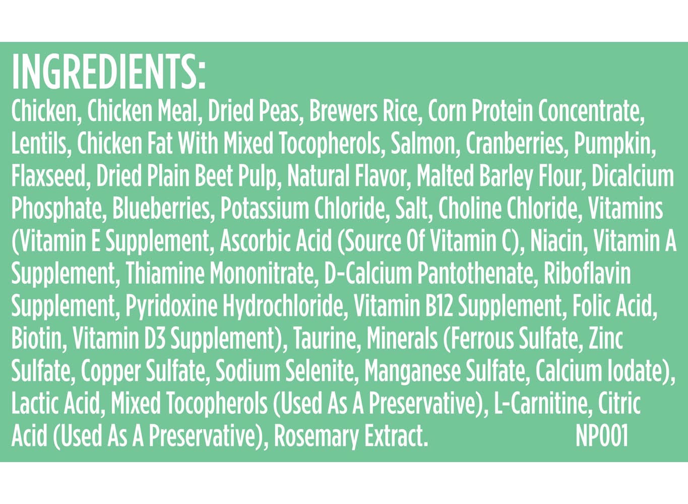 Ingredients: Chicken, Chicken Meal, Dried Peas, Brewers Rice, Corn Protein Concentrate, Lentils, Chicken Fat (preserved With Mixed Tocopherols), Salmon, Cranberries, Pumpkin, Flaxseed, Dried Plain Beet Pulp, Natural Flavor, Malted Barley Flour, Dicalcium Phosphate, Blueberries, Potassium Chloride, Salt, Choline Chloride, Vitamins (vitamin E Supplement, Ascorbic Acid (source Of Vitamin C), Niacin, Vitamin A Supplement, Thiamine Mononitrate, D-calcium Pantothenate, Riboflavin Supplement, Pyridoxine Hydrochloride, Vitamin B12 Supplement, Folic Acid, Biotin, Vitamin D3 Supplement), Taurine, Minerals (ferrous Sulfate, Zinc Sulfate, Copper Sulfate, Sodium Selenite, Manganese Sulfate, Calcium Iodate), Lactic Acid, Mixed Tocopherols (used As A Preservative), Citric Acid (used As A Preservative), Rosemary Extract. Contains: Barley, Fish, Corn.