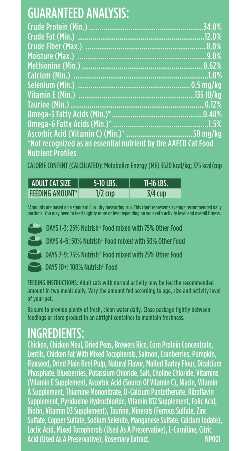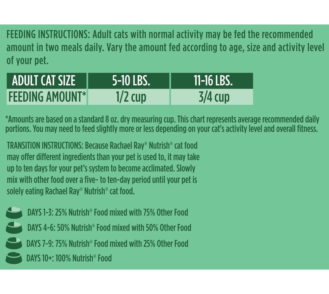 Directions for use: Adult Cat Size: 5 lbs. Feeding Amount (Amounts are based on a standard 8 oz. Dry measuring cup. This chart represents average recommended daily portions. You may need to feed slightly more or less depending on your cat's activity level and overall fitness). 1/3 cup. Adult Cat Size: 10 lbs. Feeding Amount. Adult Cat Size: 15 lbs. Feeding Amount 3/4 cup. Feeding Instructions: Adult cats with normal activity may be fed the recommended amount in two meals daily. Vary the amount fed according to age, size and activity level of your pet. Be sure to provide plenty of fresh, clean water daily. Close package tightly between feedings or store product in an airtight container to maintain freshness. Transition Instructions: Because Rachael Ray Nutrish Indoor Complete may offer different ingredients than your pet is used to, it may take up to ten days for your pet's system to become acclimated. Slowly mix with other food over a five-to ten-day period until your pet is solely eating Rachael Ray Nutrish. Days 1-3: 25% Nutrish Food mixed with 75% Other Food. Days 4-6: 50% Nutrish Food mixed with 50% Other Food. Days 7-9: 75% Nutrish Food mixed with 25% Other Food. Days 10+: 100% Nutrish Food. Storage recommendation: Keep in a cool dry place