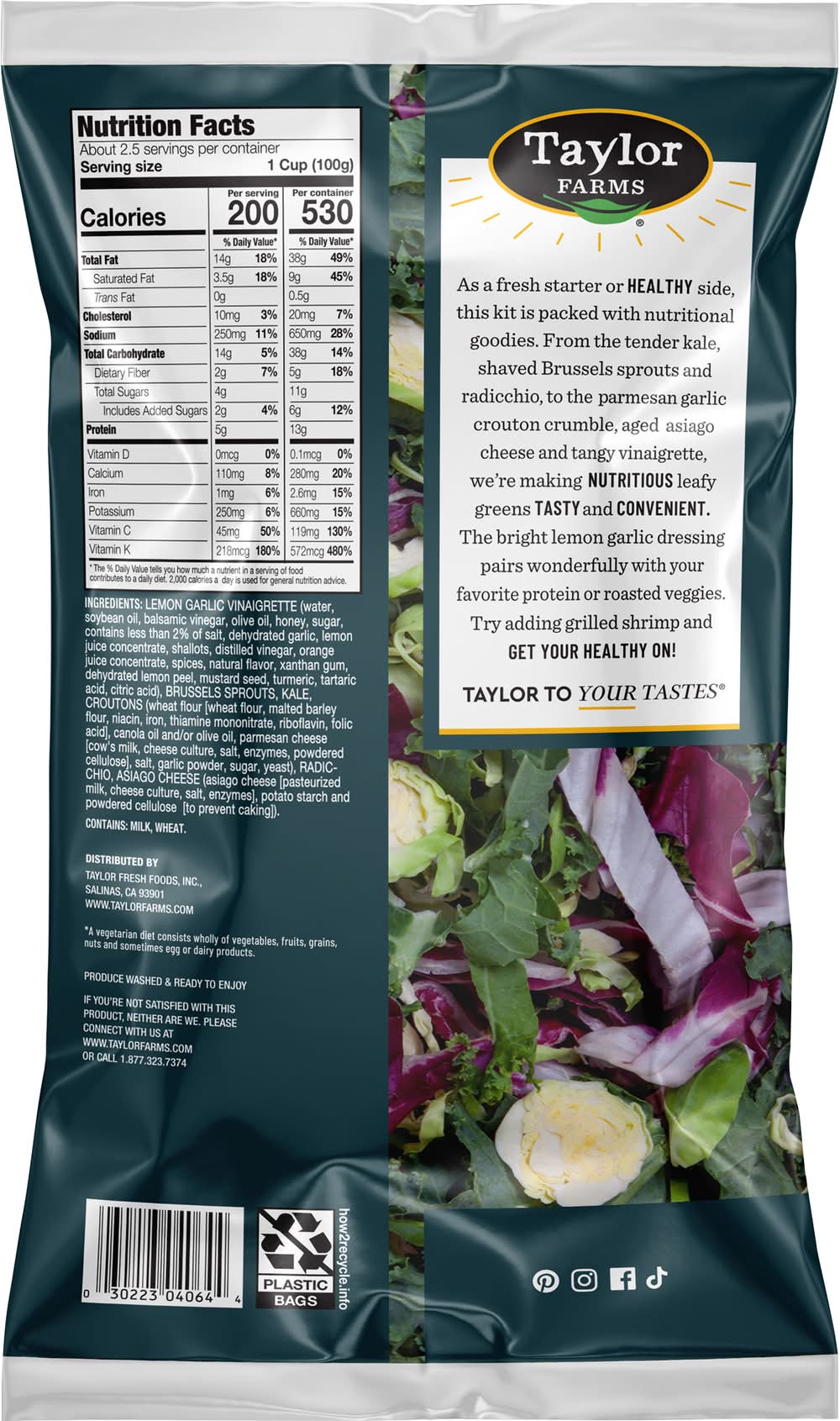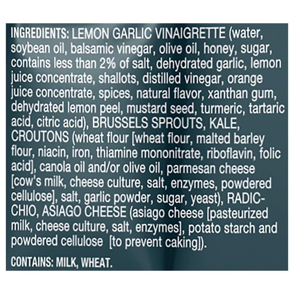 Ingredients: Lemon Garlic Vinaigrette (Water, Soybean Oil, Balsamic Vinegar, Olive Oil, Honey, Sugar, Contains Less than 2% of Salt, Dehydrated Garlic, Lemon Juice Concentrate, Shallots, Distilled Vinegar, Orange Juice Concentrate, Spices, Natural Flavor, Xanthan Gum, Dehydrated Lemon Peel, Mustard Seed, Turmeric, Tartaric Acid, Citric Acid), Brussels Sprouts, Kale, Croutons (Wheat Flour [Wheat Flour, Malted Barley Flour, Niacin, Iron, Thiamine Mononitrate, Riboflavin, Folic Acid], Canola Oil and/or Olive Oil, Parmesan Cheese [Cow's Milk, Cheese Culture, Salt, Enzymes, Powdered Cellulose], Salt, Garlic Powder, Sugar, Yeast), Radicchio, Asiago Cheese (Asiago Cheese [Pasteurized Milk, Cheese Culture, Salt, Enzymes], Potato Starch and Powdered Cellulose [to Prevent Caking]) Contains: Milk, Wheat, Soybeans, Mustard, Barley