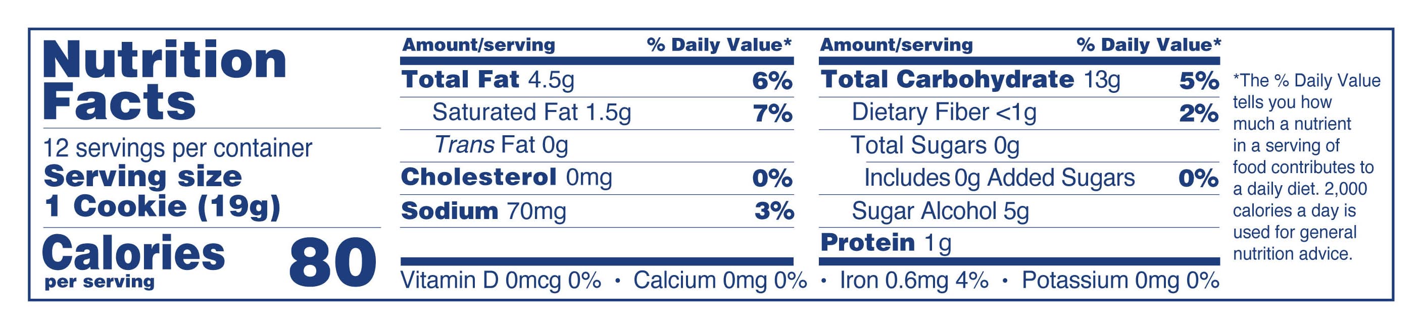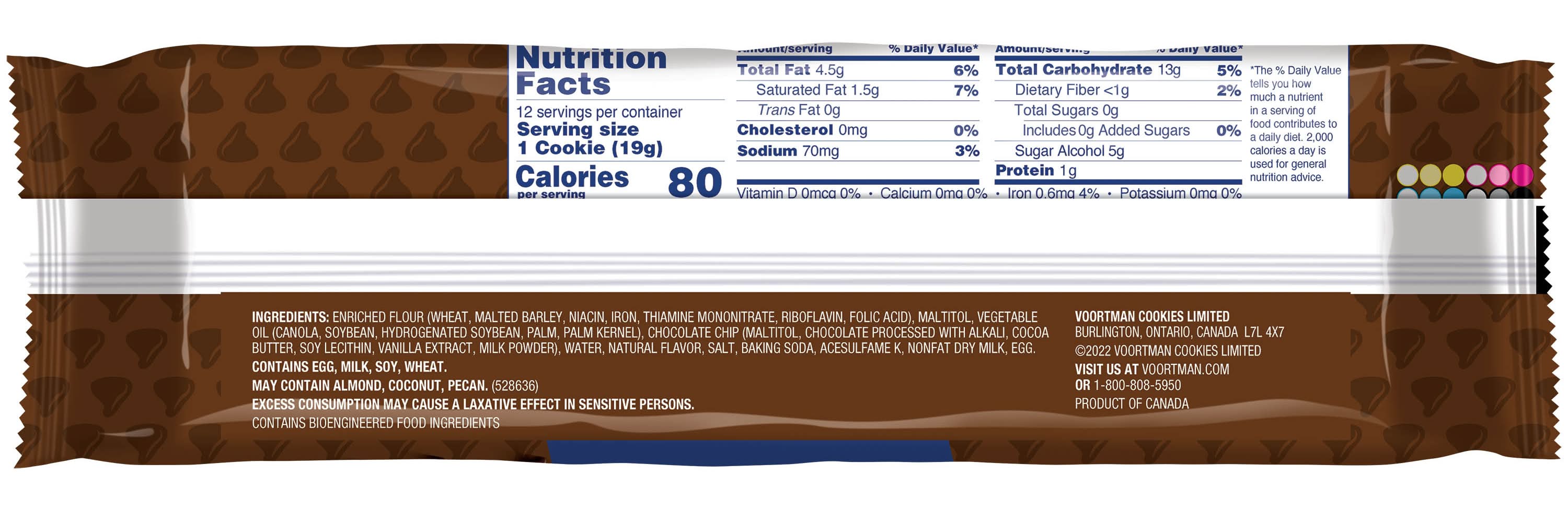 A wonderful, sugar-free way to satisfy your sweet tooth and bring joy to guests! When you break open a fresh pack of VOORTMAN Bakery Sugar Free Chocolate Chip Cookies, you get a feel-good snack baked to perfection. Pull out your pack and take out a few to enjoy any time of day, whether it's morning, mid-afternoon, or late at night. Pour yourself a cold glass of milk and make the most of your delicious snack time. When your guests come over, arrange VOORTMAN Sugar Free cookies on a platter for a beautiful presentation that's sure to delight. With a cookie in hand, they're sure to have a joyful time. • Flavor: Chocolate chip • Voortman cookies, Burlington,Ontario,L7L 4X7,Canada
