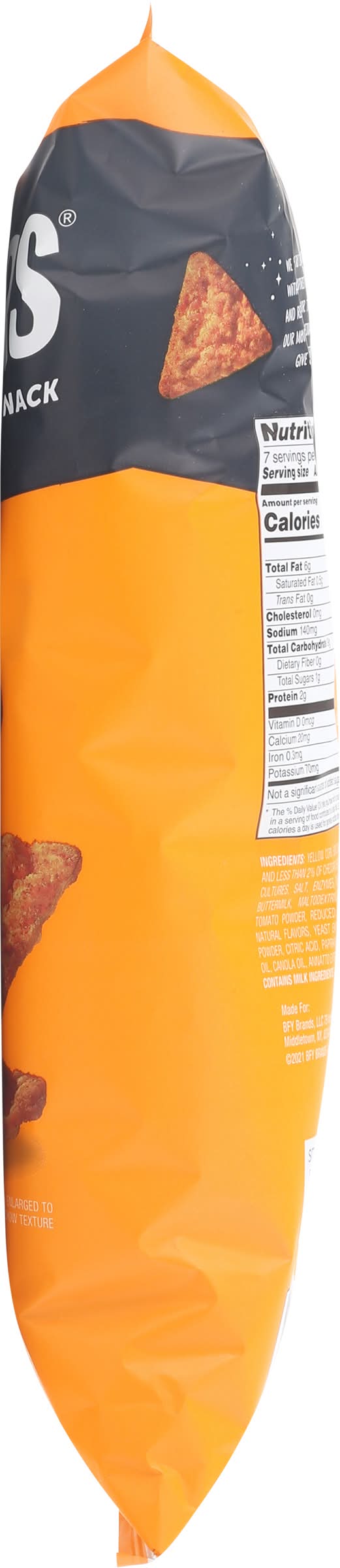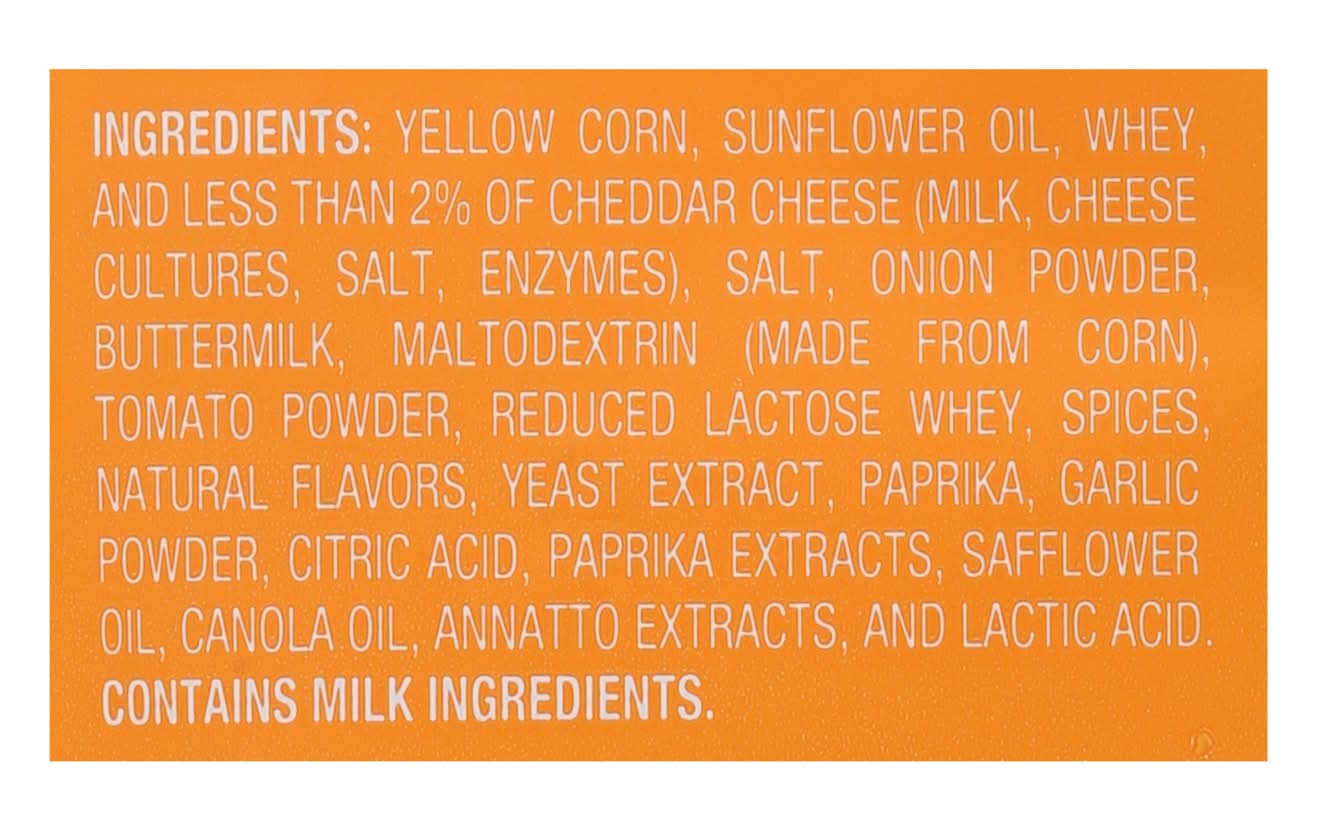 Ingredients: Yellow Corn, Sunflower Oil, Whey, and Less than 2% of Cheddar Cheese (Milk, Cheese Cultures, Salt, Enzymes), Salt, Onion Powder, Buttermilk, Maltodextrin (Made from Corn), Tomato Powder, Reduced Lactose Whey, Spices, Natural Flavors, Yeast Extract, Paprika, Garlic Powder, Citric Acid, Paprika Extracts, Safflower Oil, Canola Oil, Annatto Extracts, and Lactic Acid Contains: Milk, Corn