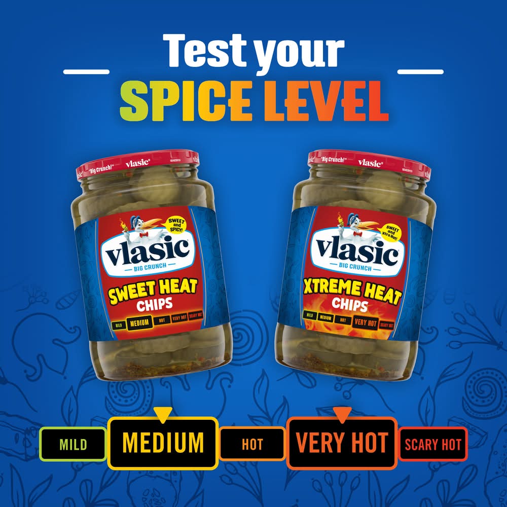 For a sweet and super-spicy spin on regular dill pickles, try Vlasic Xtreme Heat Pickle Chips. They combine a whole lot of heat with a little bit of sweet for a juicy, crunchy pickle everyone will love. They contain no artificial flavors and 20 calories per serving. From topping off a sandwich or burger, to a quick crunchy snack or midday craving buster, these spicy snacks are perfect every time. Stock your pantry with a tasty snack that always hits the spot. Vlasic: That's One Crunchy Pickle!