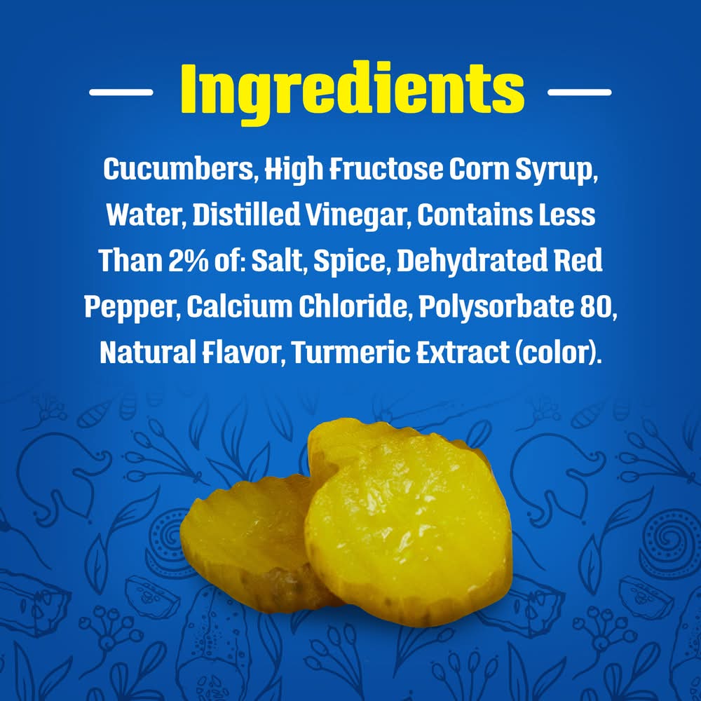 Ingredients: Cucumbers, Water, High Fructose Corn Syrup, Distilled Vinegar, Contains Less of 2% of: Salt, Spice, Dehydrated Red Pepper, Calcium Chloride, Polysorbate 80, Natural Flavor, Turmeric Extract (Color). Contains: Corn