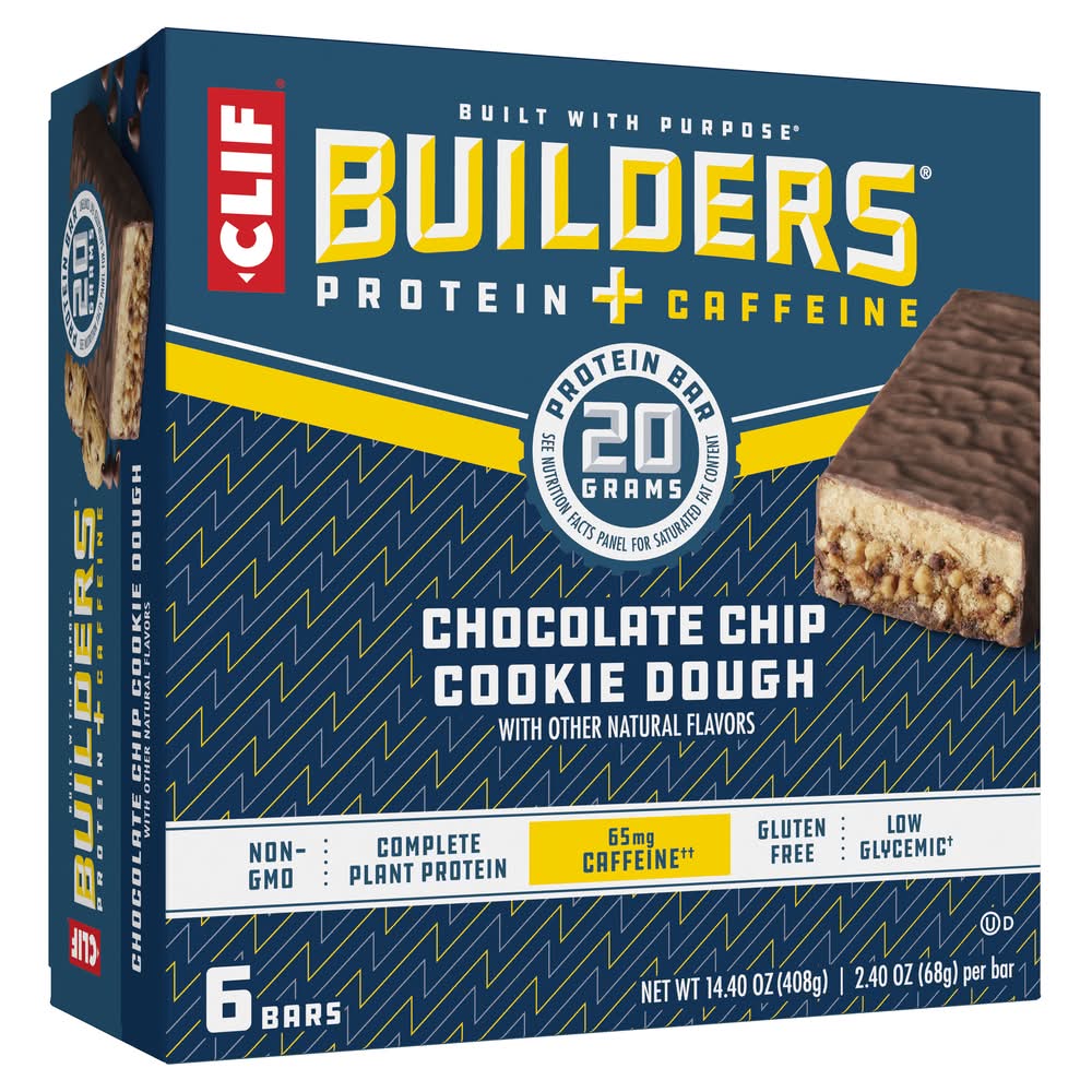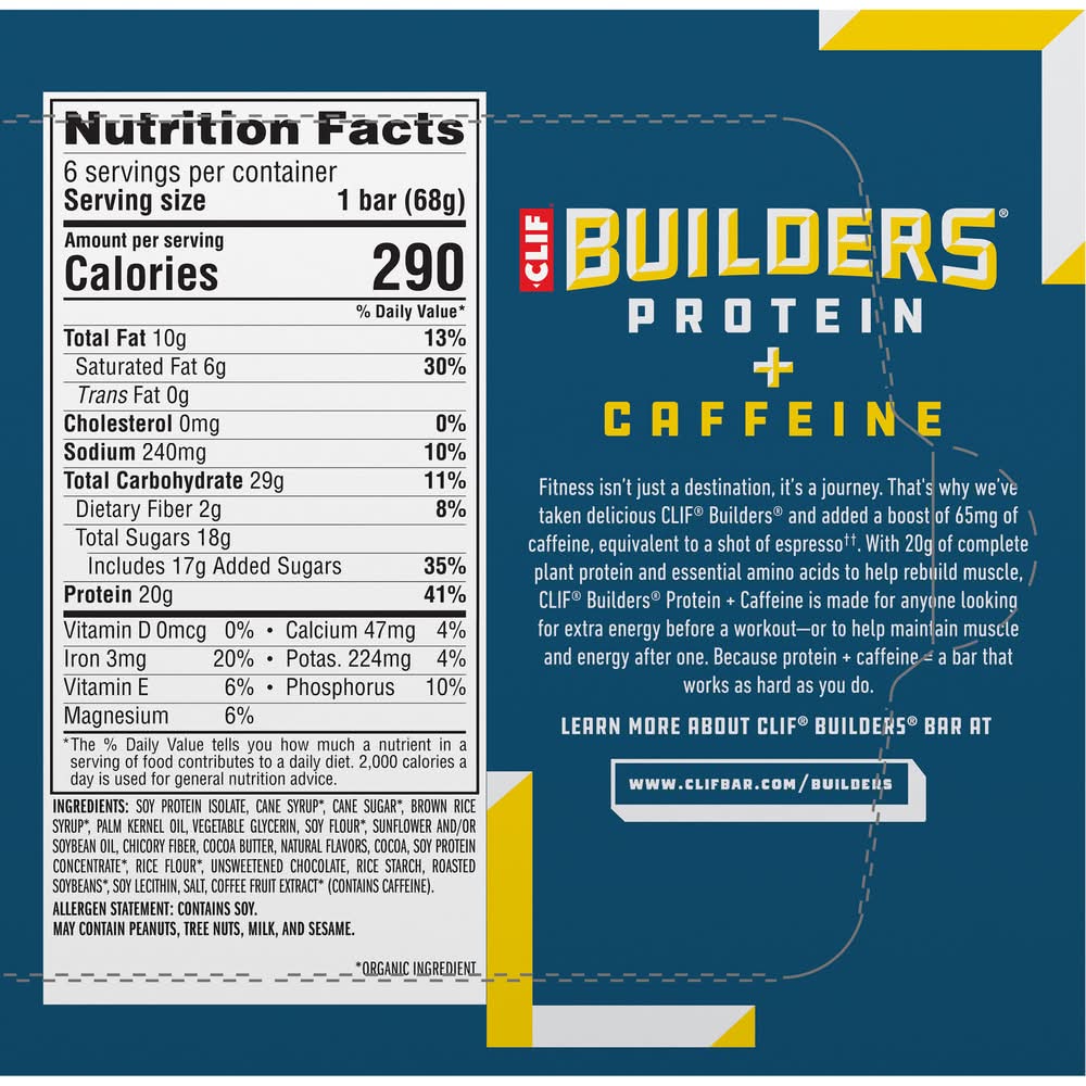 CLIF BUILDERS Protein + Caffeine is designed to fuel hardworking bodies before or after tough workouts with an extra boost, whether you’re at the gym, on the court, or on the track. High protein bars packed with 65mg caffeine** and 20g complete plant protein* including essential amino acids to help support, rebuild, and repair muscles, our gluten free protein bars work as hard as you do to build something great. Each BUILDERS bar is made with ingredients that are more sustainably sourced like Rainforest Alliance certified cocoa to turn grabbing our bar into raising the bar. These plant protein bars are also non-GMO, gluten free, and low glycemic with no high-fructose corn syrup or artificial flavors for a powerful (and tasty) addition to your pre-workout and post-workout recovery regimen. *See nutrition for saturated fat content. **Caffeine can range between 60-70 mg. Not recommended for pregnant or nursing women, children under 18 years old, or people sensitive to caffeine.