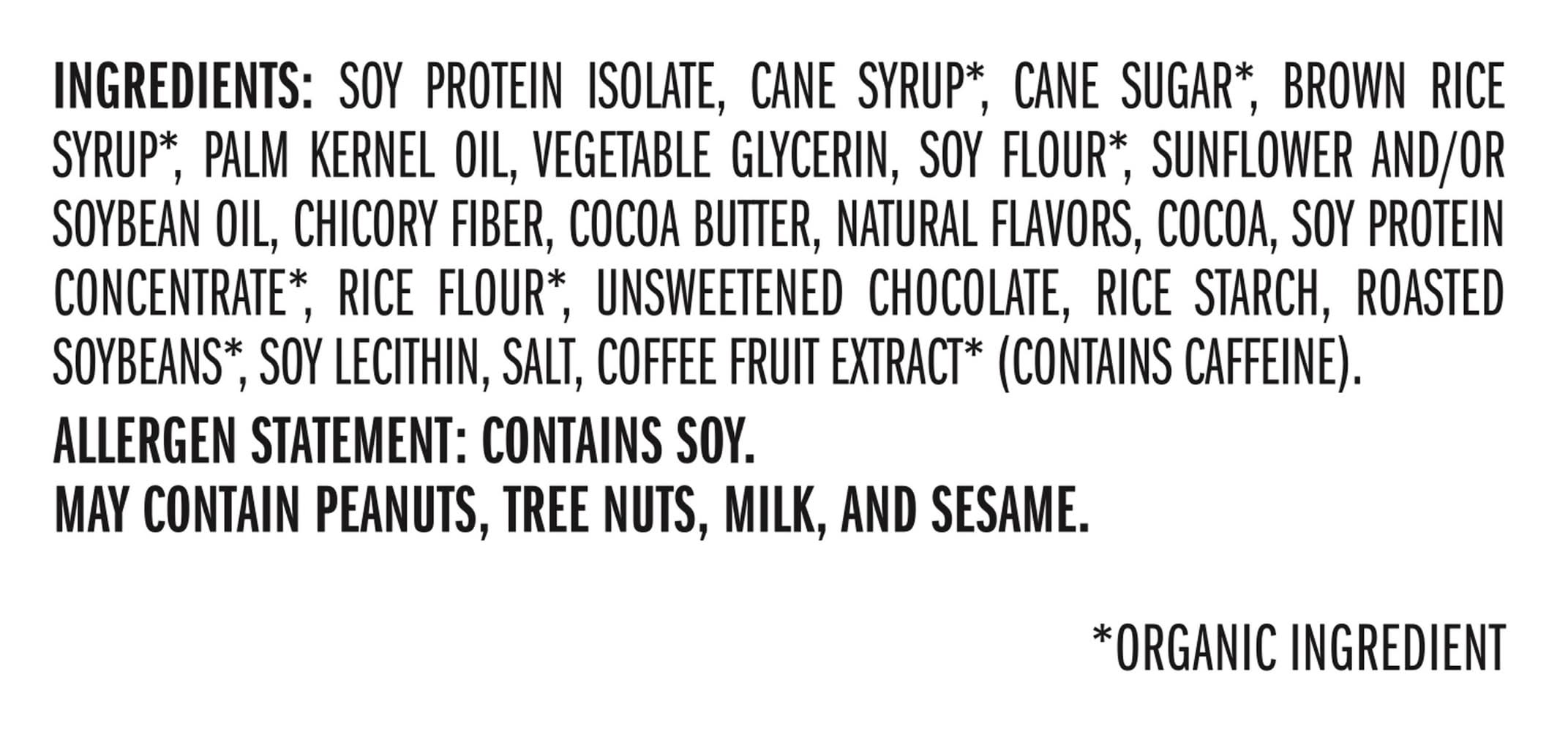 Ingredients: INGREDIENTS: SOY PROTEIN ISOLATE, CANE SYRUP*, CANE SUGAR*, BROWN RICE SYRUP*, PALM KERNEL OIL, VEGETABLE GLYCERIN, SOY FLOUR*, SUNFLOWER AND, OR SOYBEAN OIL, CHICORY FIBER, COCOA BUTTER, NATURAL FLAVORS, COCOA, SOY PROTEIN CONCENTRATE*, RICE FLOUR*, UNSWEETENED CHOCOLATE, RICE STARCH, ROASTED SOYBEANS*, SOY LECITHIN, SALT, COFFEE FRUIT EXTRACT* (CONTAINS CAFFEINE), .ALLERGEN STATEMENT: CONTAINS SOY. MAY CONTAIN PEANUTS, TREE NUTS, MILK, AND SESAME. Contains: ALLERGEN STATEMENT: CONTAINS SOY. MAY CONTAIN PEANUTS, TREE NUTS, MILK, AND SESAME.