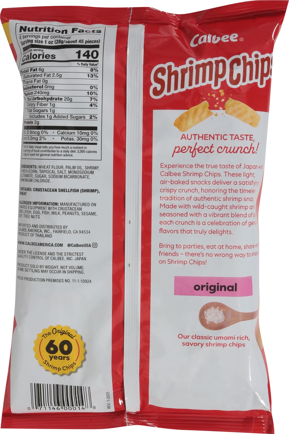 A delectable new snack made with tidbits of shrimp, wheat flour and vegetable oil blended together and toasted to a golden crispy crunch. Calbee North America, LLC, Boardman, OR, 97818