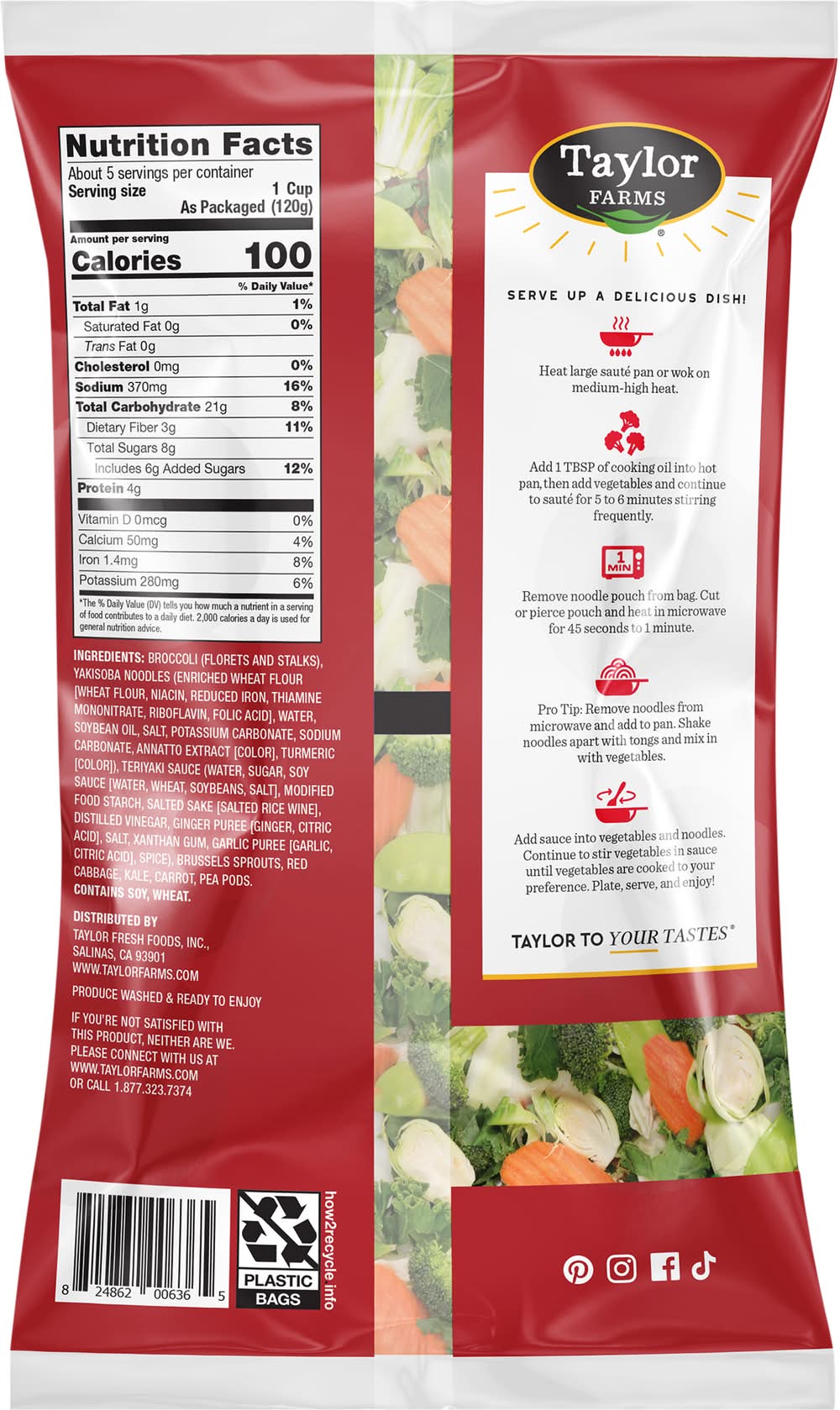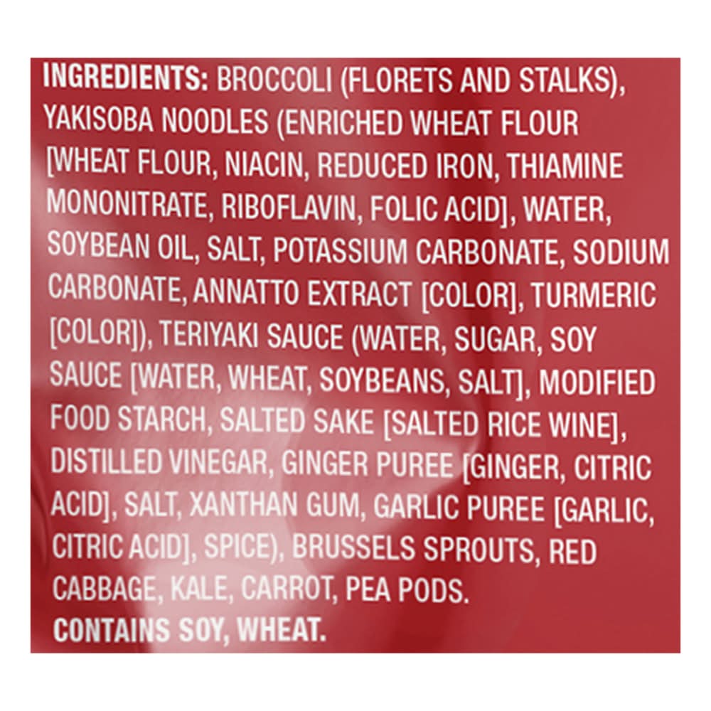 Ingredients: Broccoli (Florets and Stalks), Yakisoba Noodles (Enriched Wheat Flour [Wheat Flour, Niacin, Reduced Iron, Thiamine Mononitrate, Riboflavin, Folic acid), Water, Soybean Oil, Salt, Potassium Carbonate, Sodium Carbonate, Annatto Extract [Color], Turmeric [Color]), Teriyaki Sauce (Water, Sugar, Soy Sauce [Water, Wheat, Soybeans, Salt), Modified Food Starch, Salted Sake [Salted Rice Wine), Distilled Vinegar, Ginger Puree [Ginger, Citric Acid], Salt, Xanthan Gum, Garlic Puree [Garlic, Citric Acid), Spice), Brussels Sprouts, Red Cabbage, Kale, Carrot, Pea Pods Contains: Wheat, Soybeans