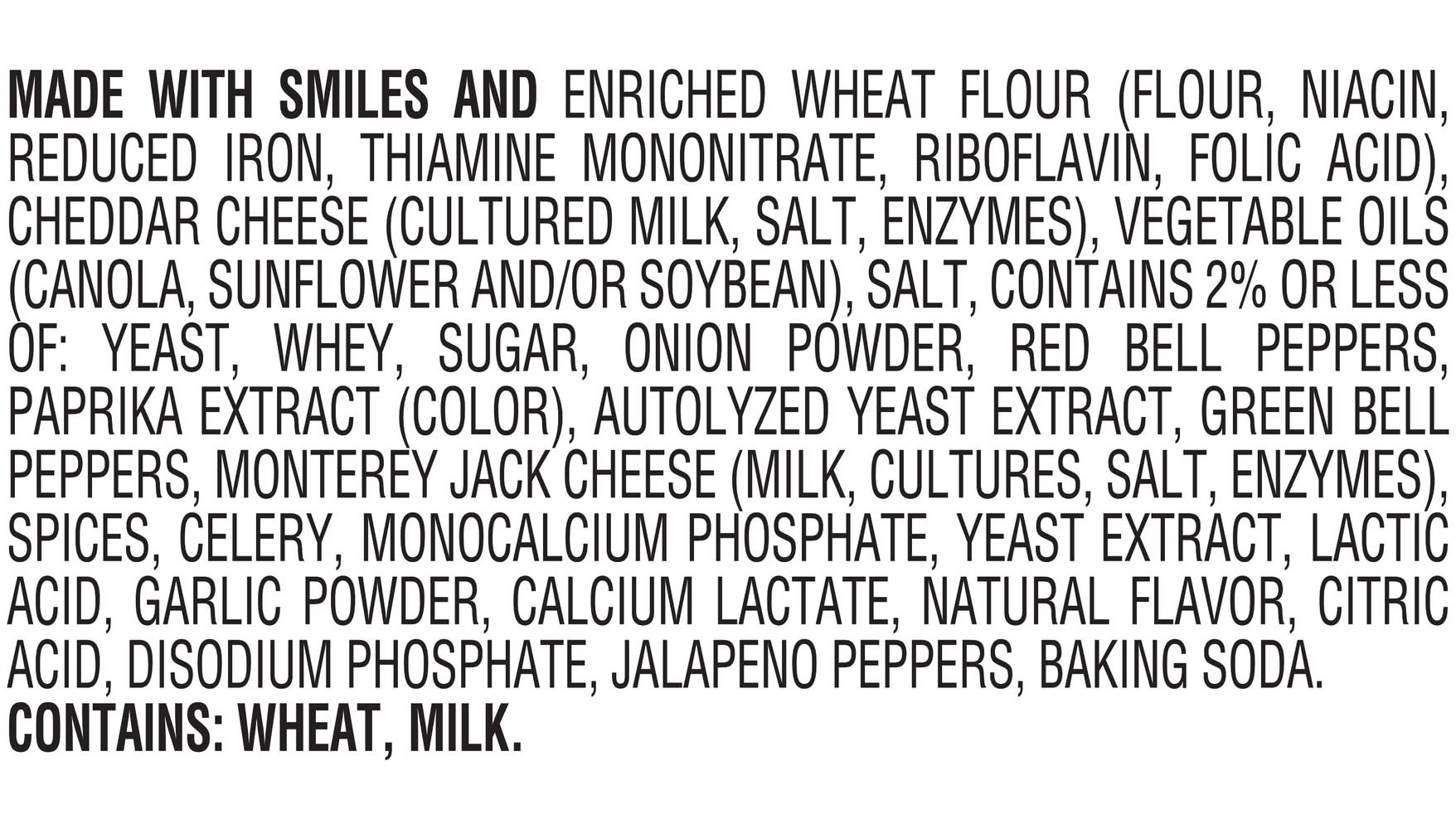 Ingredients: MADE WITH SMILES AND ENRICHED WHEAT FLOUR (FLOUR, NIACIN, REDUCED IRON, THIAMINE MONONITRATE, RIBOFLAVIN, FOLIC ACID), CHEDDAR CHEESE (CULTURED MILK, SALT, ENZYMES), VEGETABLE OILS (CANOLA, SUNFLOWER AND/OR SOYBEAN), SALT, CONTAINS 2% OR LESS OF: YEAST, WHEY, SUGAR, ONION POWDER, RED BELL PEPPERS, PAPRIKA EXTRACT (COLOR), AUTOLYZED YEAST EXTRACT, GREEN BELL PEPPERS, MONTEREY JACK CHEESE (MILK, CULTURES, SALT, ENZYMES), SPICES, CELERY, MONOCALCIUM PHOSPHATE, YEAST EXTRACT, LACTIC ACID, GARLIC POWDER, CALCIUM LACTATE, NATURAL FLAVOR, CITRIC ACID, DISODIUM PHOSPHATE, JALAPENO PEPPERS, BAKING SODA. CONTAINS: WHEAT, MILK. Contains: CONTAINS: Gluten, Milk/Dairy, Wheat