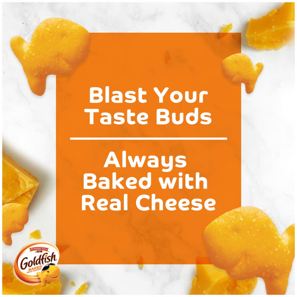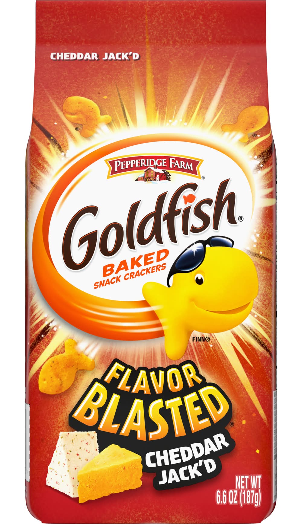 Kick snack time up a notch with the intense flavor of Goldfish Flavor Blasted Cheddar Jack'd snack crackers. Like all of our cheese varieties, they’re always baked with real cheese, and are made with no artificial flavors or preservatives. So add a little fun to your snack time with the cheesy goodness you love plus a hint of heat you crave. For lunch, add them to soups, sprinkle them on salads or just simply munch them as a side with your sandwich. Or, crumble them up and use them to bread chicken breasts for an exciting spin on dinner. From snack time to meal time, there are so many ways to enjoy the goodness of Goldfish. And if you are looking to add a little more flavor in your life, give our other Flavor Blasted crackers a try, like Xtra Cheddar or Cheesy Pizza. Go for the handful! • Flavor: Cheddar - cheddar con sabor • Pepperidge Farm, Inc., Norwalk,CT,06856 • Packaging: Reusable