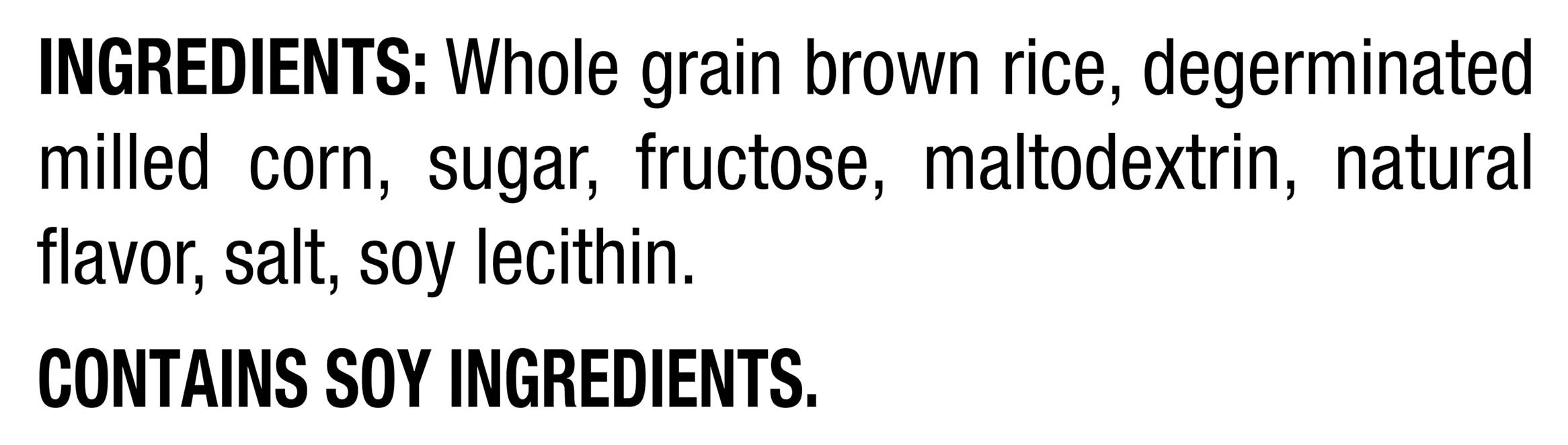 Ingredients: Whole Grain Brown Rice, Degerminated Milled Corn, Sugar, Fructose, Maltodextrin, Caramel Color, Natural Flavor, Salt, Soy Lecithin. Contains: Corn, Soybeans