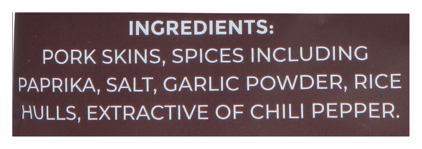 Ingredients: Pork Skins, Spices Including Paprika, Salt, Garlic Powder, Rice Hulls, Extractive of Chili Pepper Contains: Gluten