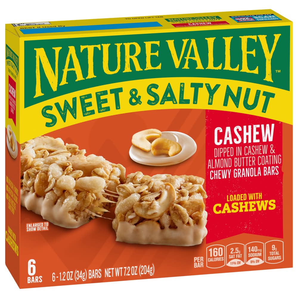 Sweet. Salty. Adventure-ready. Nature Valley Cashew Sweet and Salty Nut Granola Bars are positively bursting with savory cashews and sweet granola. Dipped in a delicious cashew and almond butter coating, this portable snack is perfect for the pantry, lunch box, and hiking trail. These bars contain no artificial flavors, artificial colors, or high fructose corn syrup. Stock up for a breakfast snack bar, an office snack, or an on the go treat everyone in your household can enjoy. • Pack size: 6 • General Mills Sales, Inc., Minneapolis,MN,55440, • Packaging: Reusable