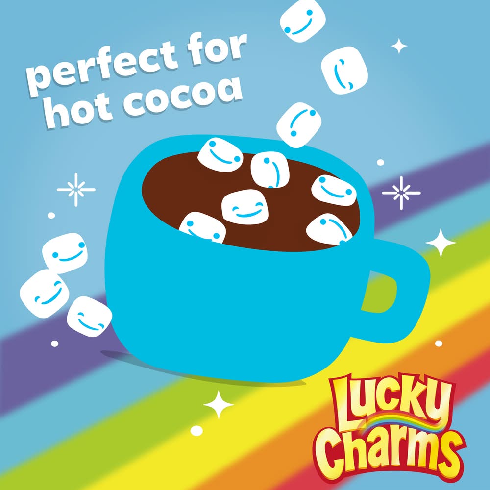 Jet-Puffed Lucky Charms Magically Delicious Marshmallows are a versatile dessert topping or sweet snack. Our Lucky Charms Marshmallows deliver the same sweet taste and fluffy texture as regular Jet Puffed Marshmallows. Enjoy our marshmallows as a magical snack for kids or as a mouthwatering addition to your favorite dessert recipes. Use our fluffy marshmallows to make colored rice cereal treats. Try putting Jet Puffed Marshmallows and chocolate on graham crackers to make s'mores. You could also try using our colored marshmallows for hot chocolate. Each package of marshmallows comes sealed in a 7-ounce bag.