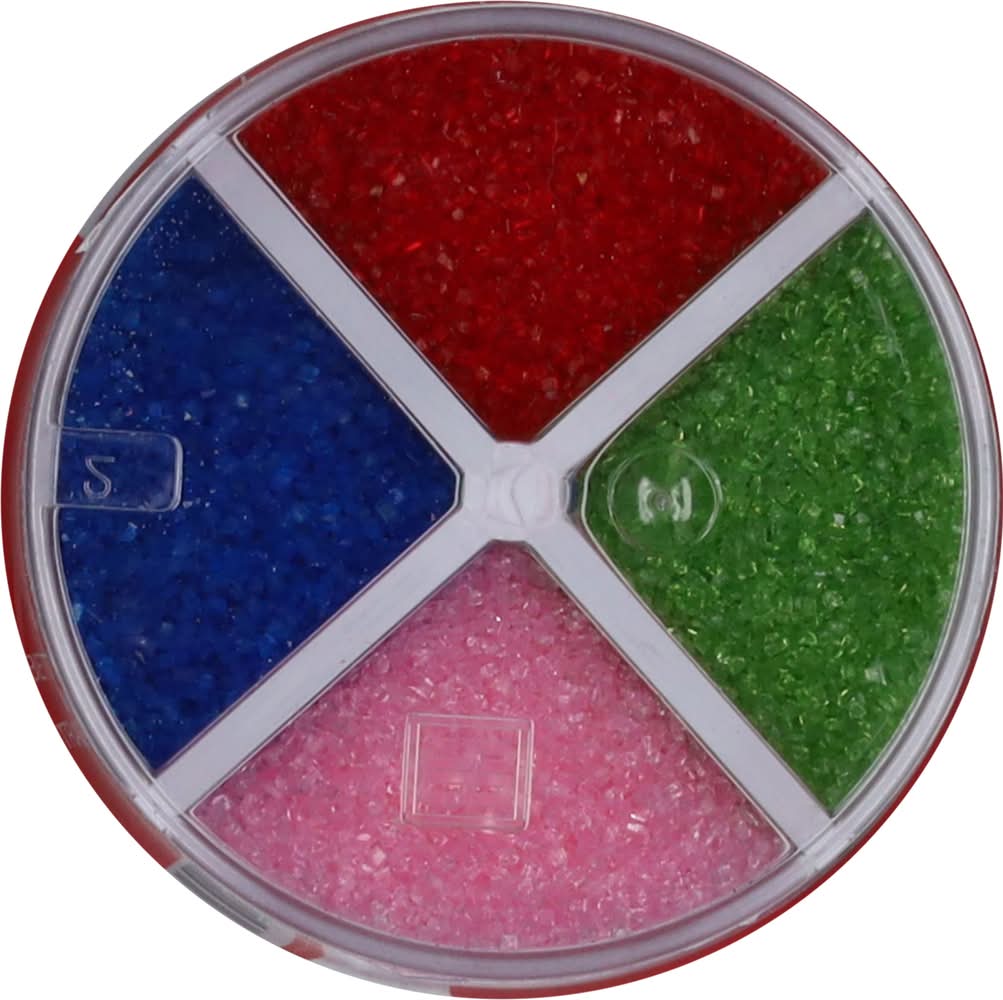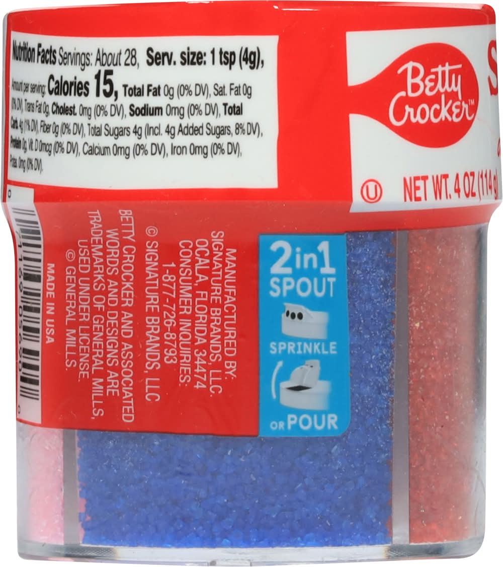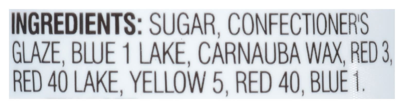 Ingredients: Sugar, Confectioner’s Glaze, Carnauba Wax, Blue 1 Lake, Red 40 Lake, Red 3, Yellow 5, Red 40, Blue 1. Contains: peanuts, tree nuts, wheat, milk or eggs