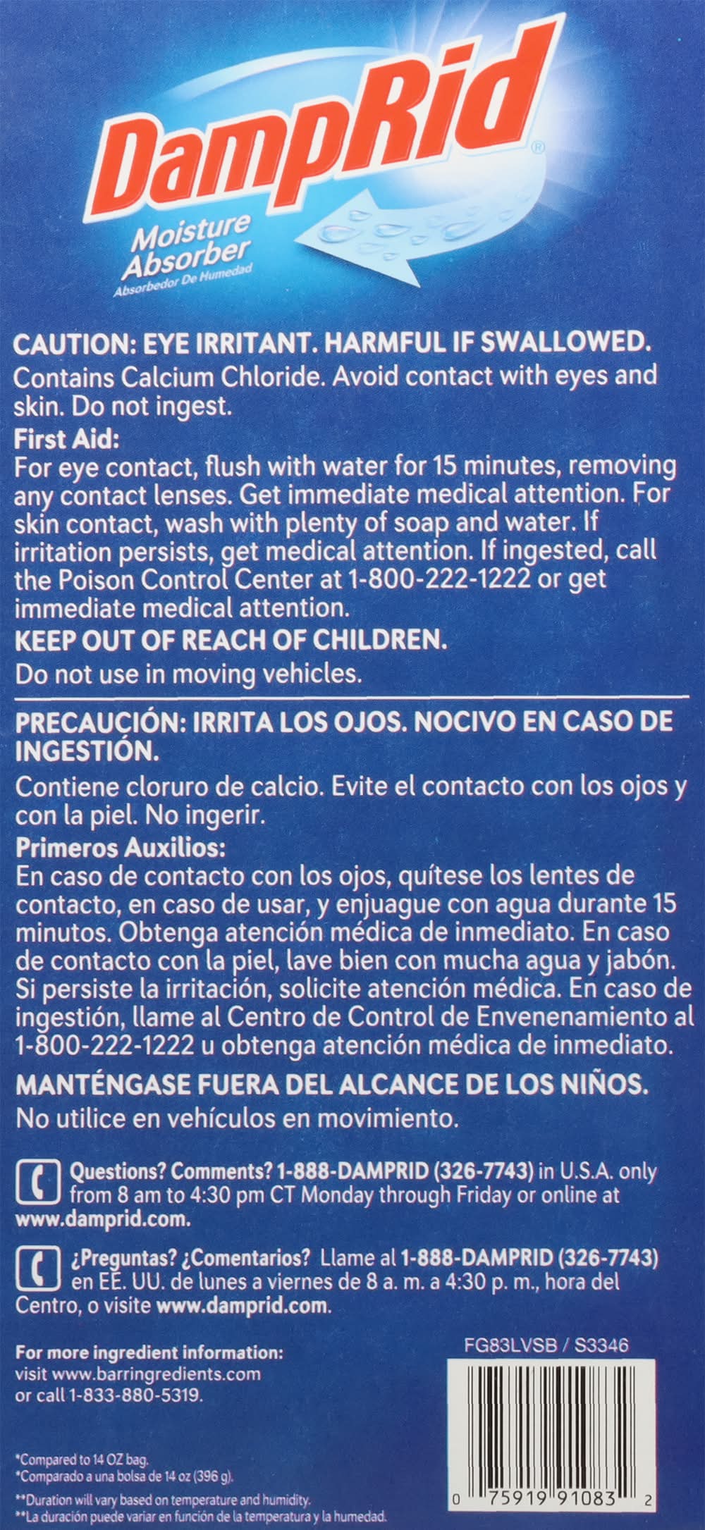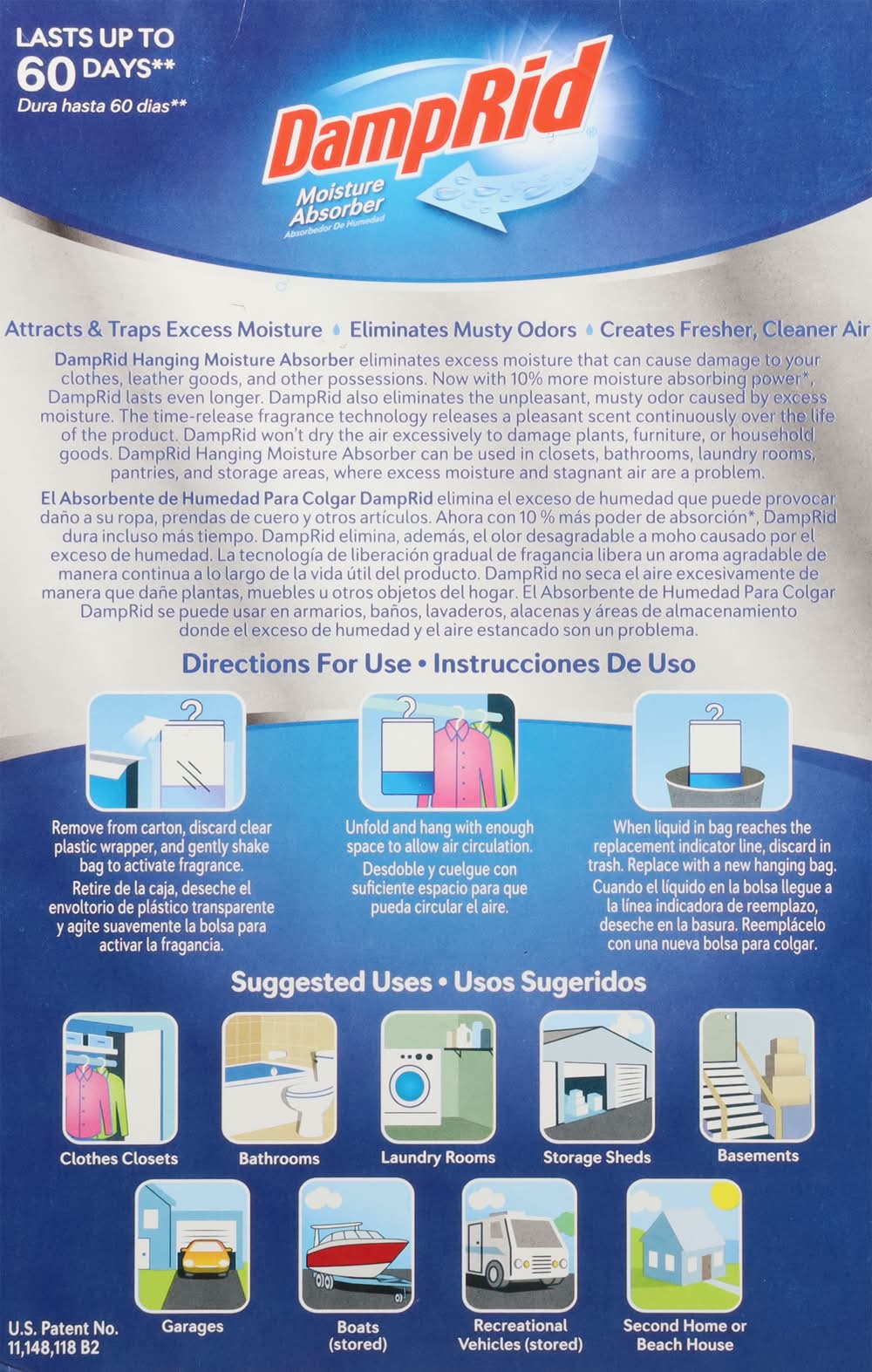 Directions for use: remove from carton, discard clear plastic wrapper, and gently shake bag to activate fragrance. unfold and hang with enough space to allow air circulation. when liquid in bag reaches the replacement indicator line, discard in trash. replace with a new hanging bag. suggested uses: clothes closets; bathrooms; laundry rooms; storage shreds; basements; garages; boats (stored); recreational vehicles (stored); second home or beach house. in case of spills: hard surfaces: wipe with damp towel. wash towel as usual. carpets: dry as much as possible with damp towel. wet spot with cool water and press dry with dry towel. repeat. wash towel as usual. clothing: hand wash all fabrics with cool water. manufacturer is not responsible for leaks caused by misuse or spills. do not allow product to contact leather or metal. ice-like crystals may form in the lower chamber of the bag and should not be disturbed. do not puncture or remove calcium chloride or collected liquid.