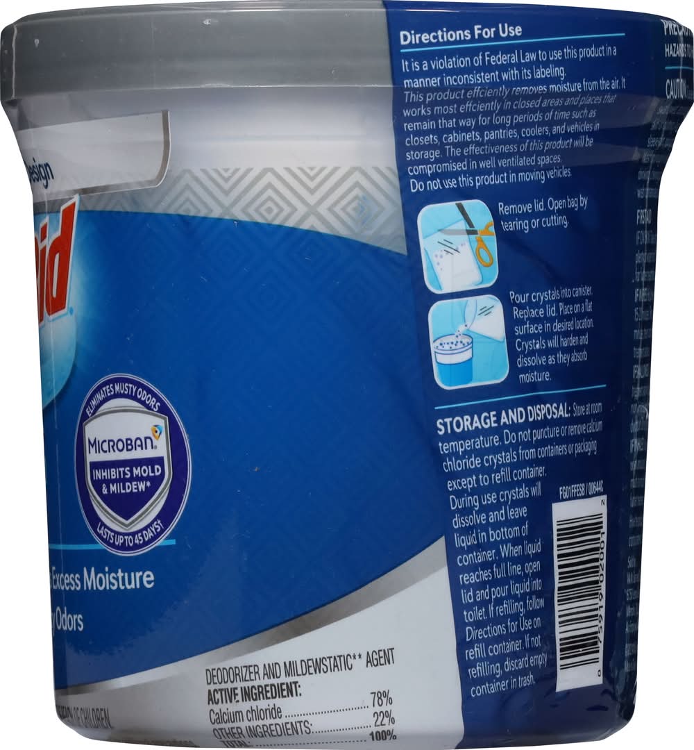 Directions for use: it is a violation of federal law to use this product in a manner inconsistent with its labeling. this product efficiently removes moisture from the air. it works most efficiently in closed areas and places that remain that way for long periods of time such as closets; cabinets; pantries; coolers and vehicles in storage. the effectiveness of this product will be compromised in well ventilated surfaces. do not use this product in moving vehicles. remove lid. open bag by tearing or cutting. pour crystals into canister. replace lid. place on a flat surface in desired location. crystals will harden and dissolve as they absorb moisture. in case of spills: hard surfaces: wipe up spill with a damp towel. discard spilled crystals in toilet. wash towel before reusing. carpets: dry spill as much as possible with a damp towel. wet spill with cool water and press dry with a towel. repeat as necessary to remove spilled crystals. discard spilled crystals in toilet. wash towel before reusing. clothing: hand wash all fabrics with cool water. do not allow collected liquid to contact leather or metal. do not remove liquid from container except to dispose of as directed. storage and disposal: store at room temperature. do not puncture or remove calcium chloride crystals from containers or packaging except to refill container. during use crystals will dissolve and leave liquid in bottom of container. when liquid reaches full line, open lid and pour liquid into toilet. if refilling, follow directions for use on refill container. if not refilling, discard empty container in trash.