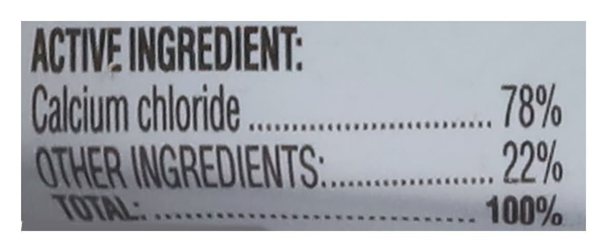 Ingredients: Active Ingredient: Calcium Chloride - 78%, Other Ingredients: 22%, Total: 100% Additives: Other Ingredients: 22%