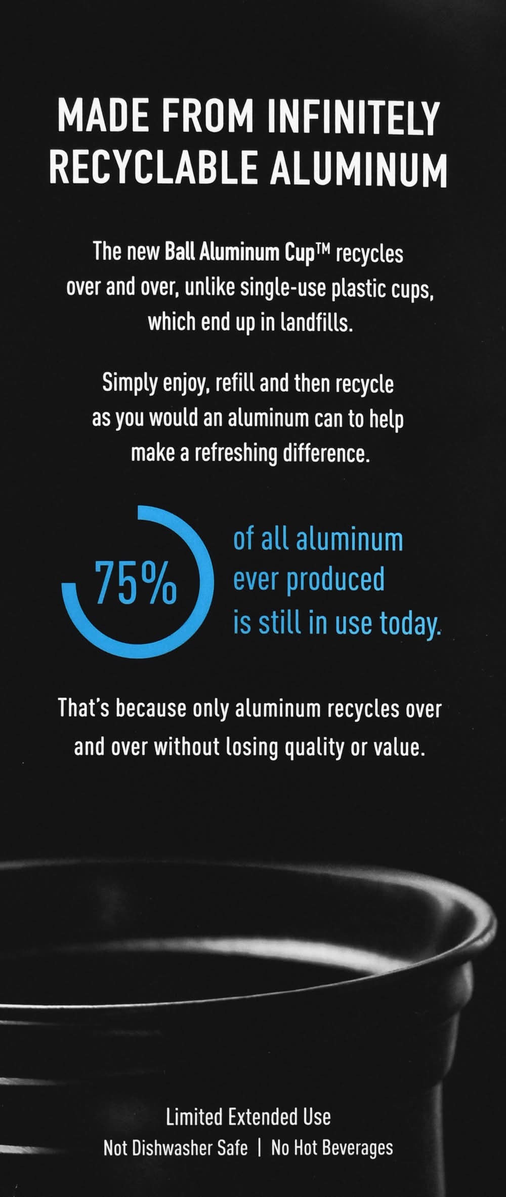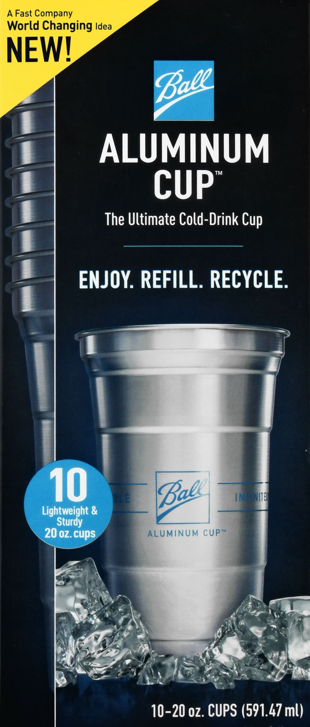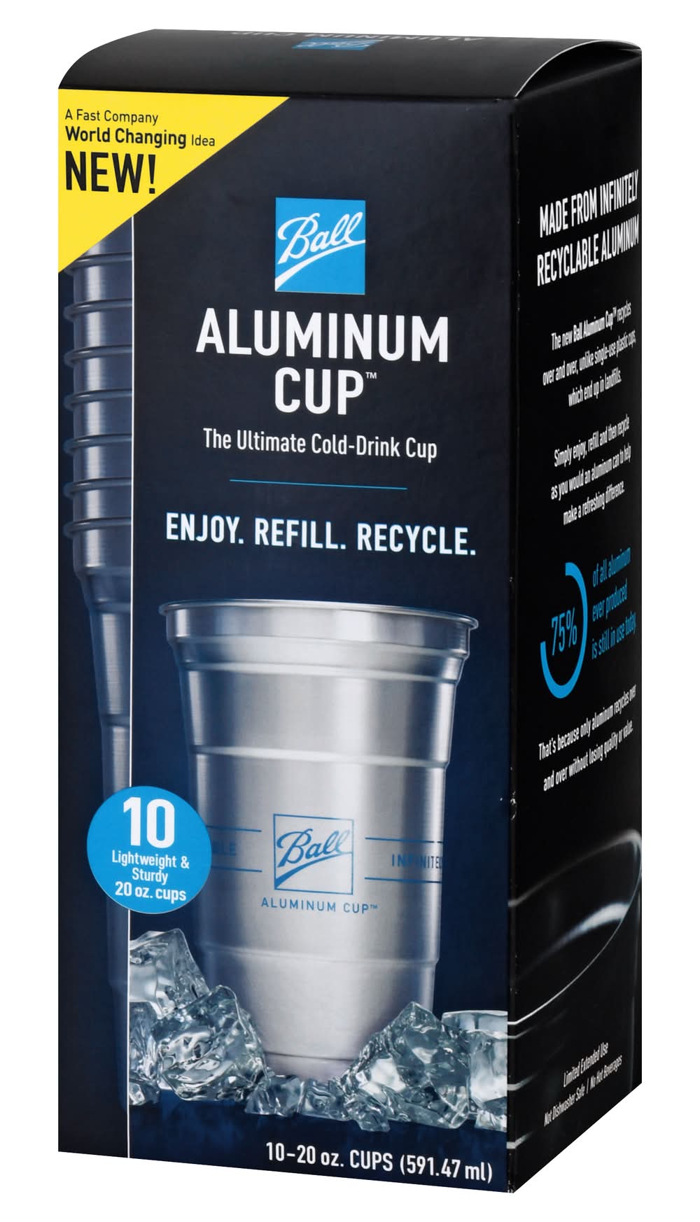 The cold drink cup. a fast company world changing idea. new enjoy elevates any occasion, including holiday parties, birthdays, outdoor gatherings and weddings. refill perfect for daily use. reduces dishwashing because you recycle the cups instead. get the best from cold drinks. lightweight & sturdy: strong design retains shape under the firmest grip and allows for multiple refills. cool touch provides a unique cold drink experience that's superior to plastic over and over, unlike single use plastic cups, which end up in landfills. simple enjoy, refill and then recycle as you would an aluminum can to help make a refreshing difference. 75% of all aluminum ever produced is still in use today. that's because only aluminum over and over without losing quality or value. limited extended use. not dishwasher safe. no hot beverages. • Color: Silver • Packaging: Reusable