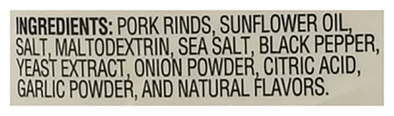 Ingredients: Pork Rinds, Sunflower Oil, Salt, Maltodextrin, Sea Salt, Black Pepper, Yeast Extract, Onion Powder, Citric Acid, Garlic Powder, and Natural Flavors