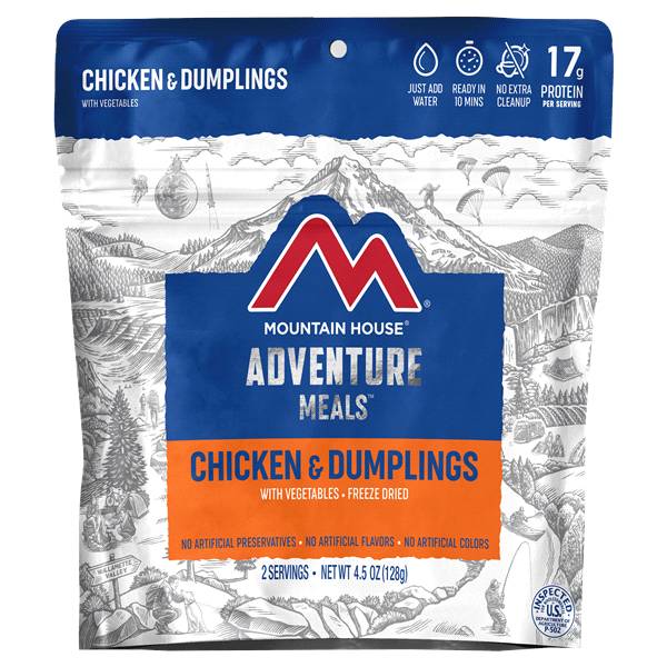 Mountain House Chicken & Dumplings offers a delightful combination of chicken, vegetables, and fluffy dumplings, all enveloped in a creamy white gravy that delivers a home-cooked taste. This product is free from artificial preservatives, flavors, and colors. It is specifically designed as an Adventure Meal, ideal for camping or backpacking, requiring only the addition of water to prepare. The meal can be ready in a short period and boasts a long shelf life, making it an excellent choice for an emergency food supply.