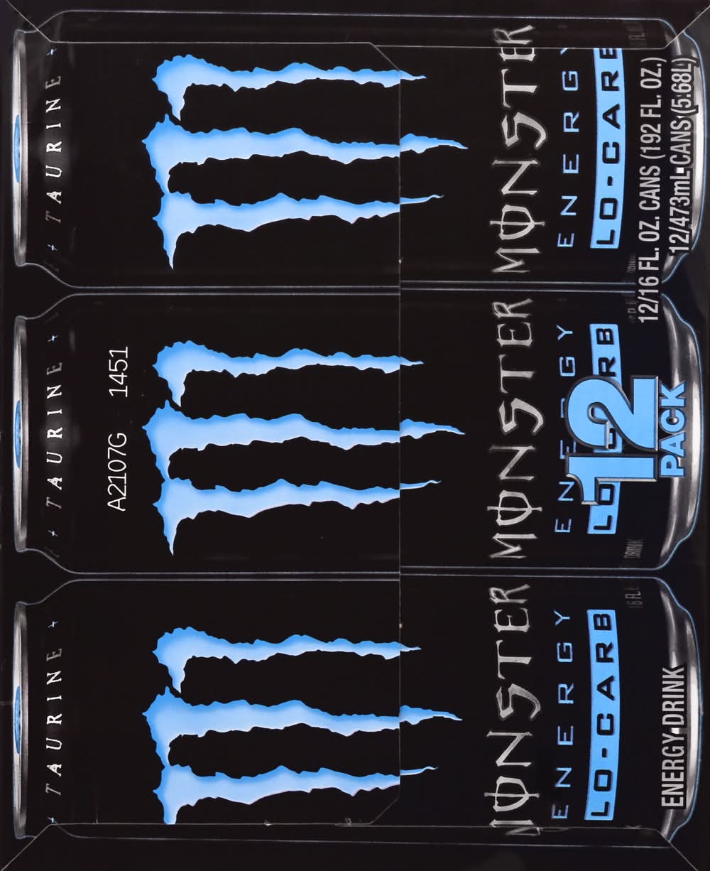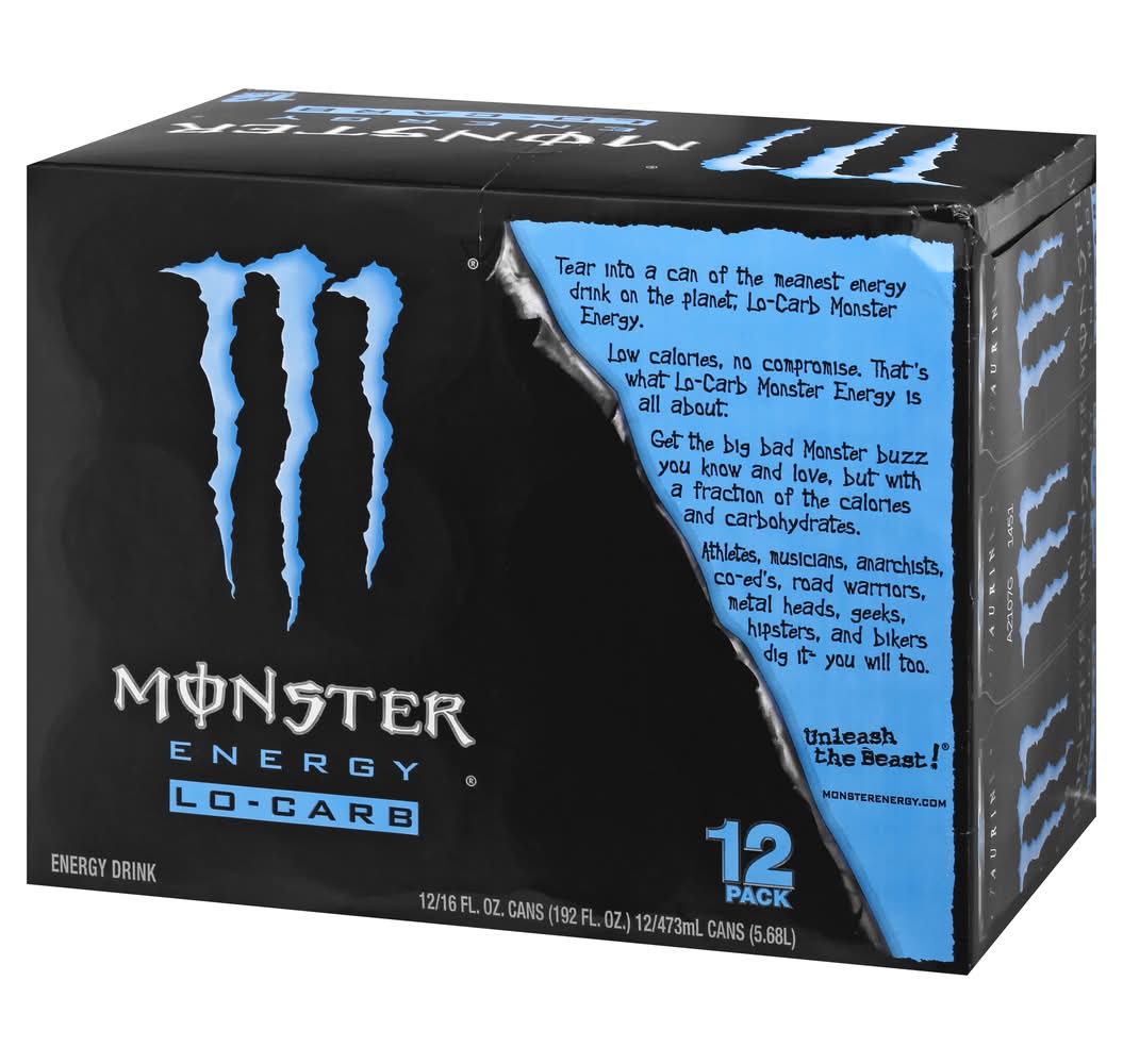 With a fraction of the calories and carbohydrates. Athletes, musicians, anarchists, co-ed's, road warriors, metal heads, geeks, hipsters, and bikers dig it you will too. • Pack size: 12 • Monster Energy Company, 1 Monster Way, Corona, CA, 92879 • Packaging: Reusable