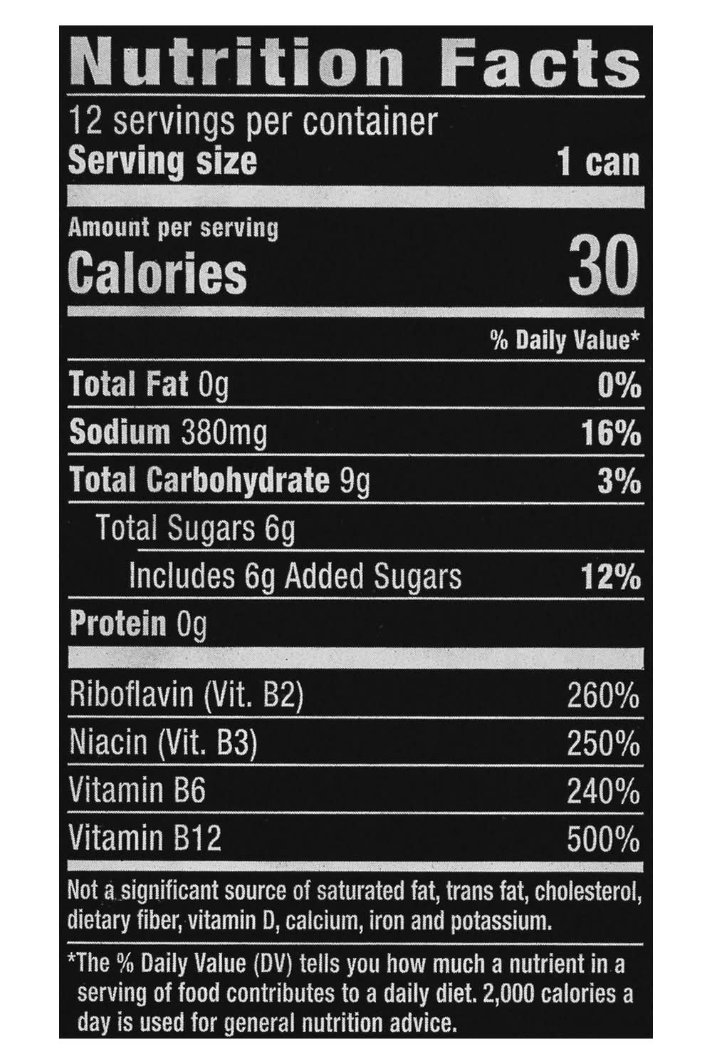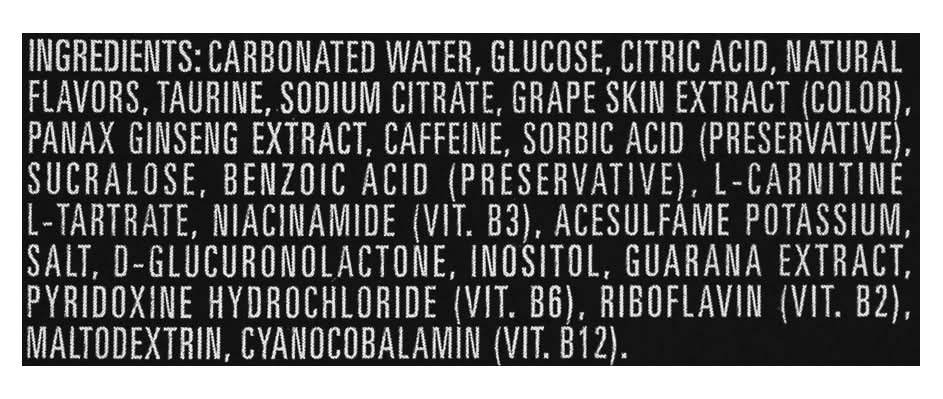Ingredients: Carbonated Water, Glucose, Citric Acid, Natural Flavors, Taurine, Sodium Citrate, Grape Skin Extract (Color), Panax Ginseng Extract, Caffeine, Sorbic Acid (Preservative), Sucralose, Benzoic Acid (Preservative), L- Carnitine L-Tartrate, Niacinamide (Vit. B3), Acesulfame Potassium, Salt, D-Glucuronolactone, Inositol, Guarana Extract, Pyridoxine Hydrochloride (Vit. B6), Riboflavin (Vit. B2), Maltodextrin, Cyanocobalamin (Vit. B12) Contains 140mg of caffeine