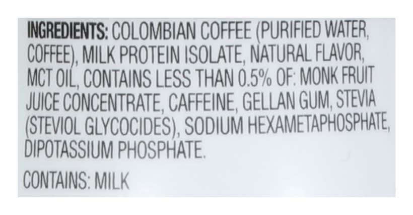 Ingredients: Colombian Coffee (Purified Water, Coffee), Milk Protein Isolate, Natural Flavor, MCT Oil, Contains Less than 0.5% of: Monk Fruit Juice Concentrate, Caffeine, Gellan Gum, Stevia (Steviol Glycocides), Sodium Hexametaphosphate, Dipotassium Phosphate Contains: Milk