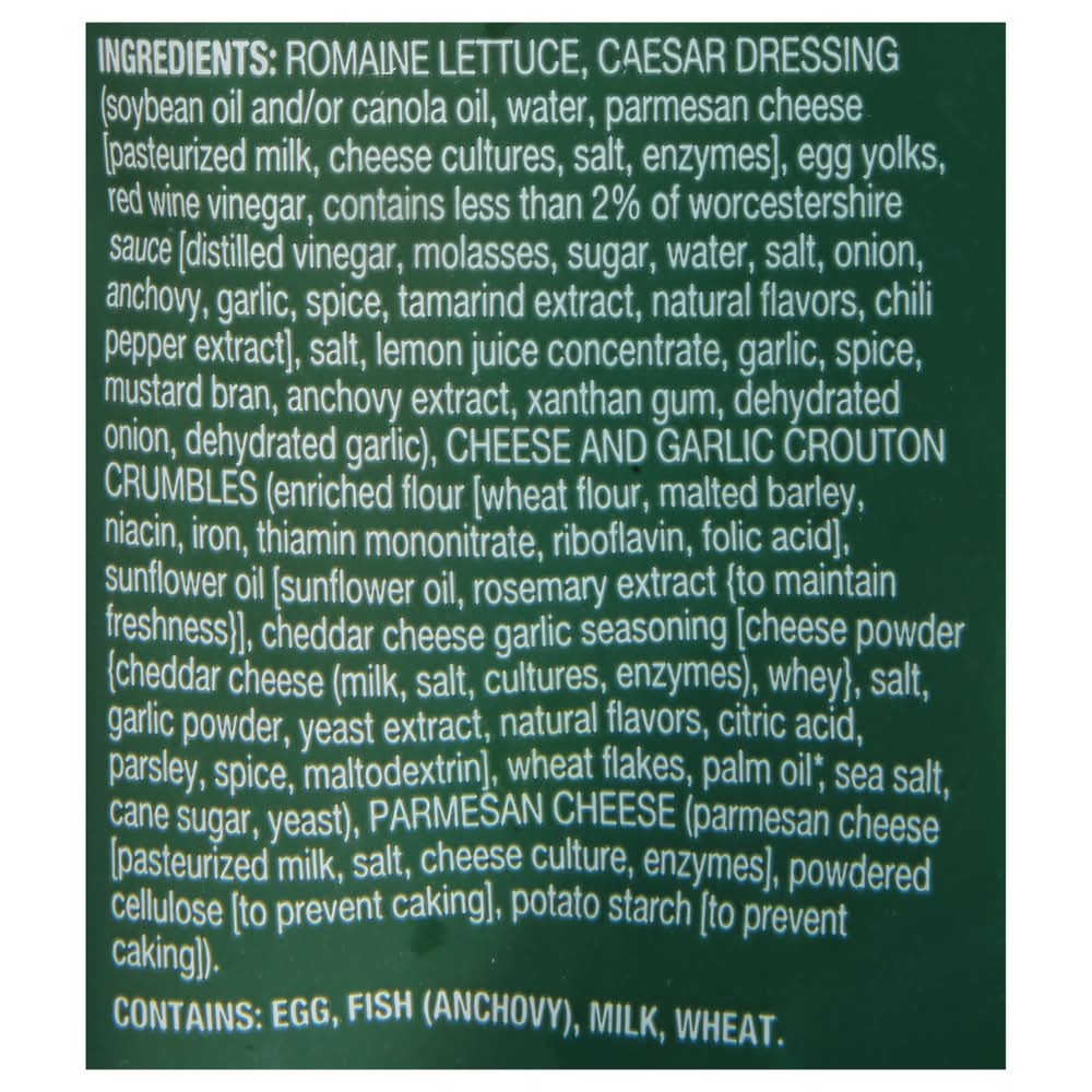Ingredients: Romaine Lettuce, Caesar Dressing (Soybean Oil and/or Canola Oil, Water, Parmesan Cheese [Pasteurized Milk, Cheese Cultures, Salt, Enzymes], Egg Yolks, Red Wine Vinegar, Contains Less than 2% of Worcestershire Sauce [Distilled Vinegar, Molasses, Sugar, Water, Salt, Onion, Anchovy, Garlic, Spice, Tamarind Extract, Natural Flavors, Chili Pepper Extract], Salt, Lemon Juice Concentrate, Garlic, Spice, Mustard Bran, Anchovy Extract, Xanthan Gum, Dehydrated Onion, Dehydrated Garlic), Cheese and Garlic Crouton Crumbles (Enriched Flour [Wheat Flour, Malted Barley, Niacin, Iron, Thiamin Mononitrate, Riboflavin, Folic Acid], Sunflower Oil [Sunflower Oil, Rosemary Extract {to Maintain Freshness}], Cheddar Cheese Garlic Seasoning [Cheese Powder {Cheddar Cheese (Milk, Salt, Cultures, Enzymes), Whey}, Salt, Garlic Powder, Yeast Extract, Natural Flavors, Citric Acid, Parsley, Spice, Maltodextrin], Wheat Flakes, Palm Oil (Responsibly Sourced Palm Oil| Www.RSPO.Org), Sea Salt, Cane Sugar, Yeast), Parmesan Cheese (Parmesan Cheese [Pasteurized Milk, Salt, Cheese Culture, Enzymes], Powdered Cellulose [to Prevent Caking], Potato Starch [to Prevent Caking]) Contains: Eggs, Milk, Wheat, Mustard, Barley