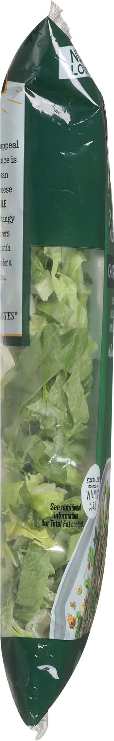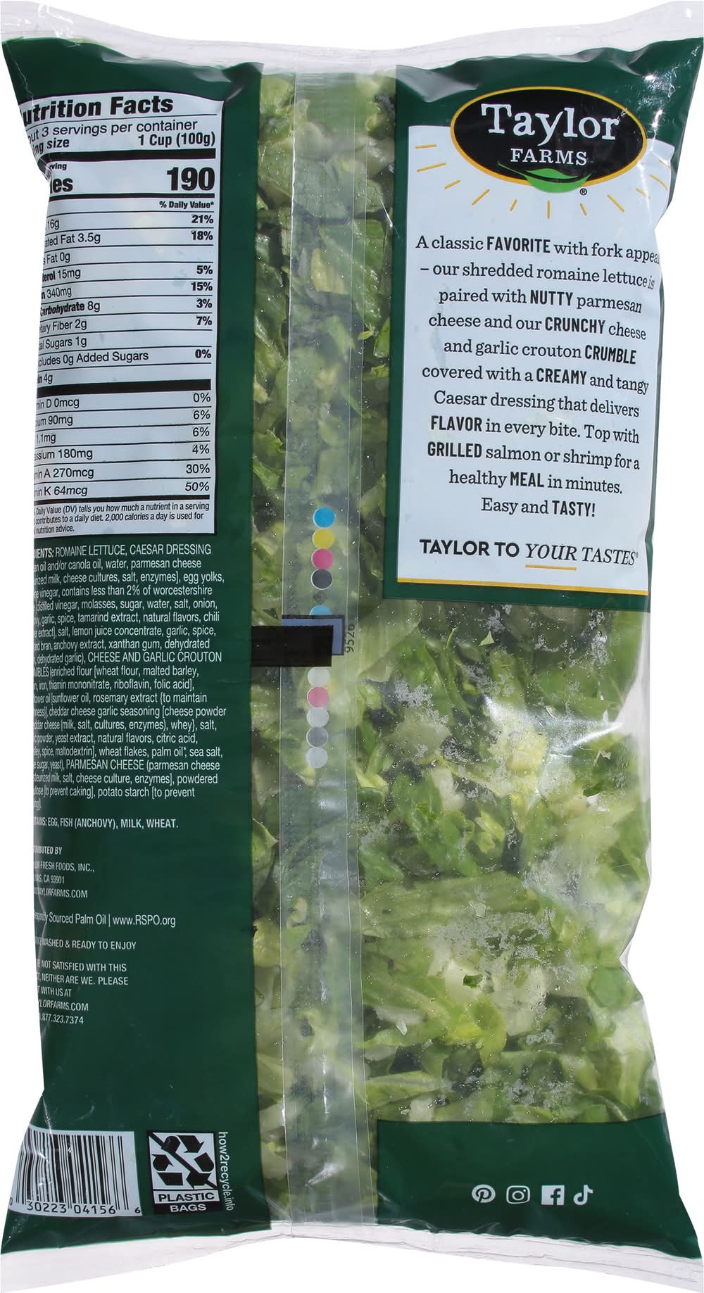 Romaine lettuce, cheese & garlic crouton crumble, parmesan cheese with Caesar Dressing. New look! A classic favorite with fork appeal - our shredded romaine lettuce is paired with nutty parmesan cheese and our crunchy cheese and garlic crouton crumble covered with a creamy and tangy caesar dressing that delivers flavor in every bite. Top with grilled salmon or shrimp for a healthy meal in minutes. Easy and tasty! Taylor to your tastes.