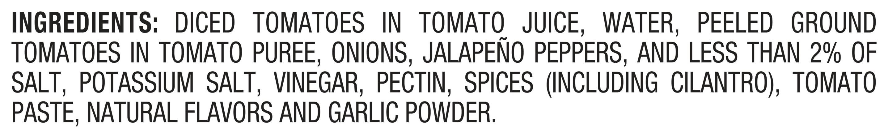 Ingredients: Diced Tomatoes In Tomato Juice, Water, Peeled Ground Tomatoes In Tomato Puree, Onions, Jalapeño Peppers, And Less Than 2% Of Salt, Potassium Salt, Vinegar, Pectin, Spices (Including Cilantro), Tomato Paste, Natural Flavors And Garlic Powder