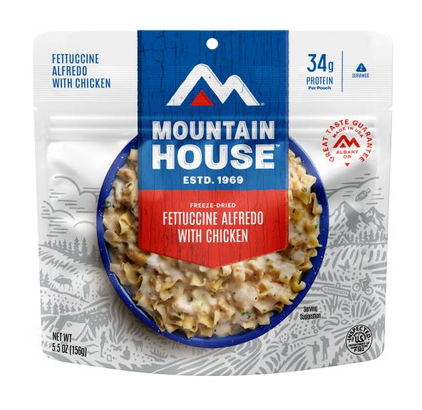 Mountain House Adventure Meal Fettuccine Alfredo with Chicken is a just add water pouch, designed for quick preparation and convenience. It is easy to pack and carry, making it suitable for use both on the go and at home. The meal, which is ready in minutes, combines pasta, butter, parmesan, and chicken, offering the ultimate comfort food experience.