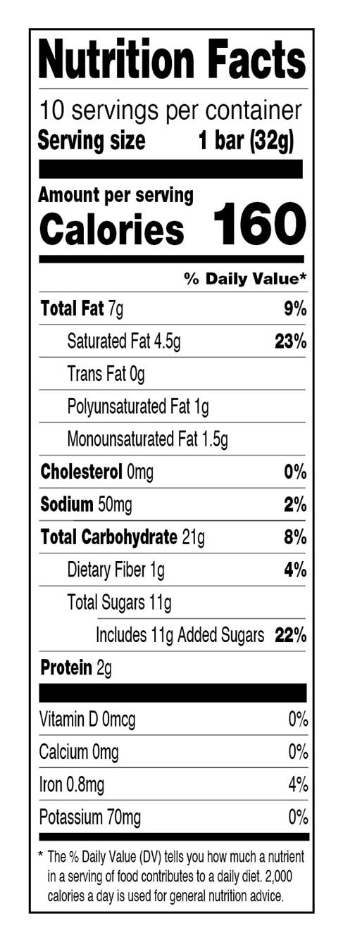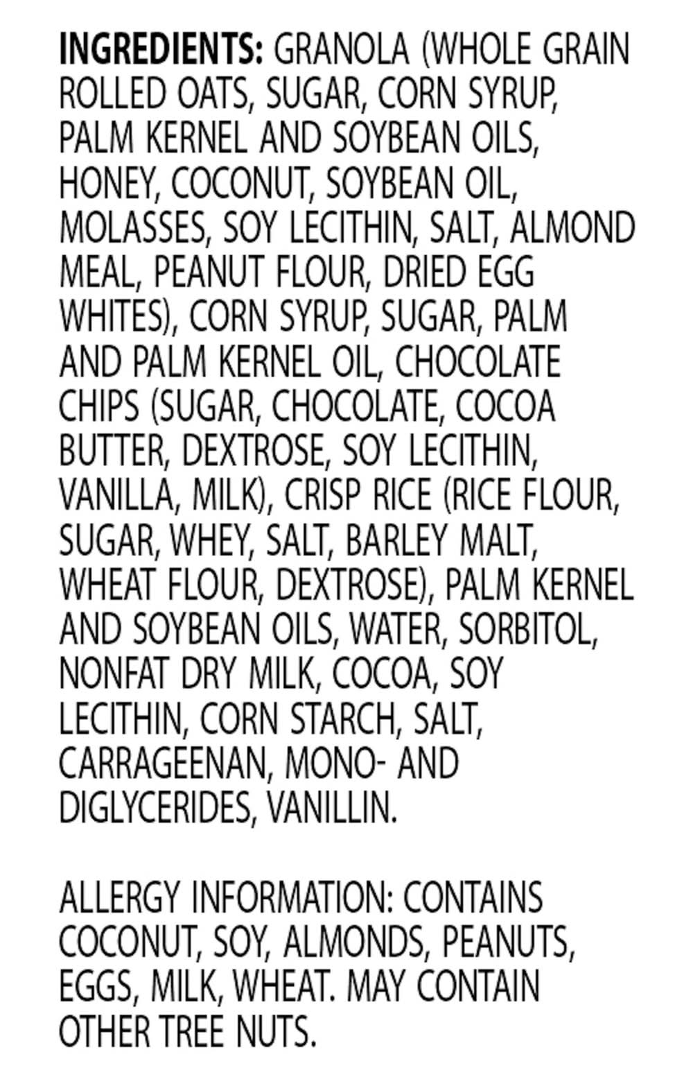 Ingredients: Granola (Whole Grain Rolled Oats, Sugar, Palm Kernel and Soybean Oils, Corn Syrup, Coconut, Honey, Molasses, Soy Lecithin, Salt, Corn Starch, Peanuts, Almonds, Soy Flour, Egg Whites), Corn Syrup, Sugar, Palm and Palm Kernel Oil, Chocolate Chips (Sugar, Chocolate, Cocoa Butter, Dextrose, Soy Lecithin, Vanilla, Milk), Crisp Rice (Rice Flour, Sugar, Whey, Salt, Barley Malt, Wheat Flour, Dextrose), Palm Kernel and Soybean Oils, Water, Cocoa, Nonfat Dry Milk, Sorbitol, Soy Lecithin, Corn Starch, Salt, Carrageenan, Mono- and Diglycerides, Vanillin Contains: Tree Nuts, Coconuts, Soybeans, Peanuts, Tree Nuts, Almonds, Eggs, Milk, Wheat, Corn, Tree Nuts