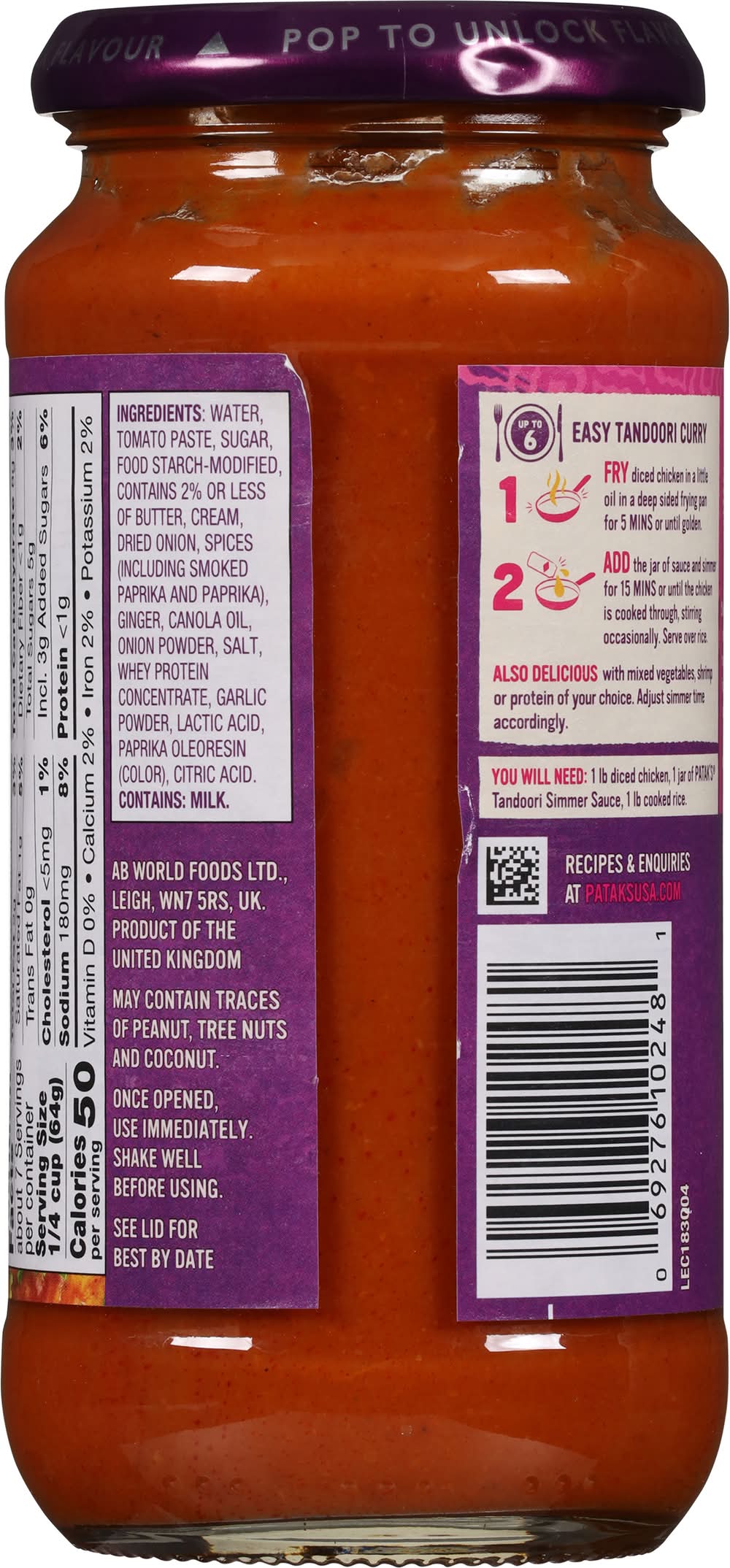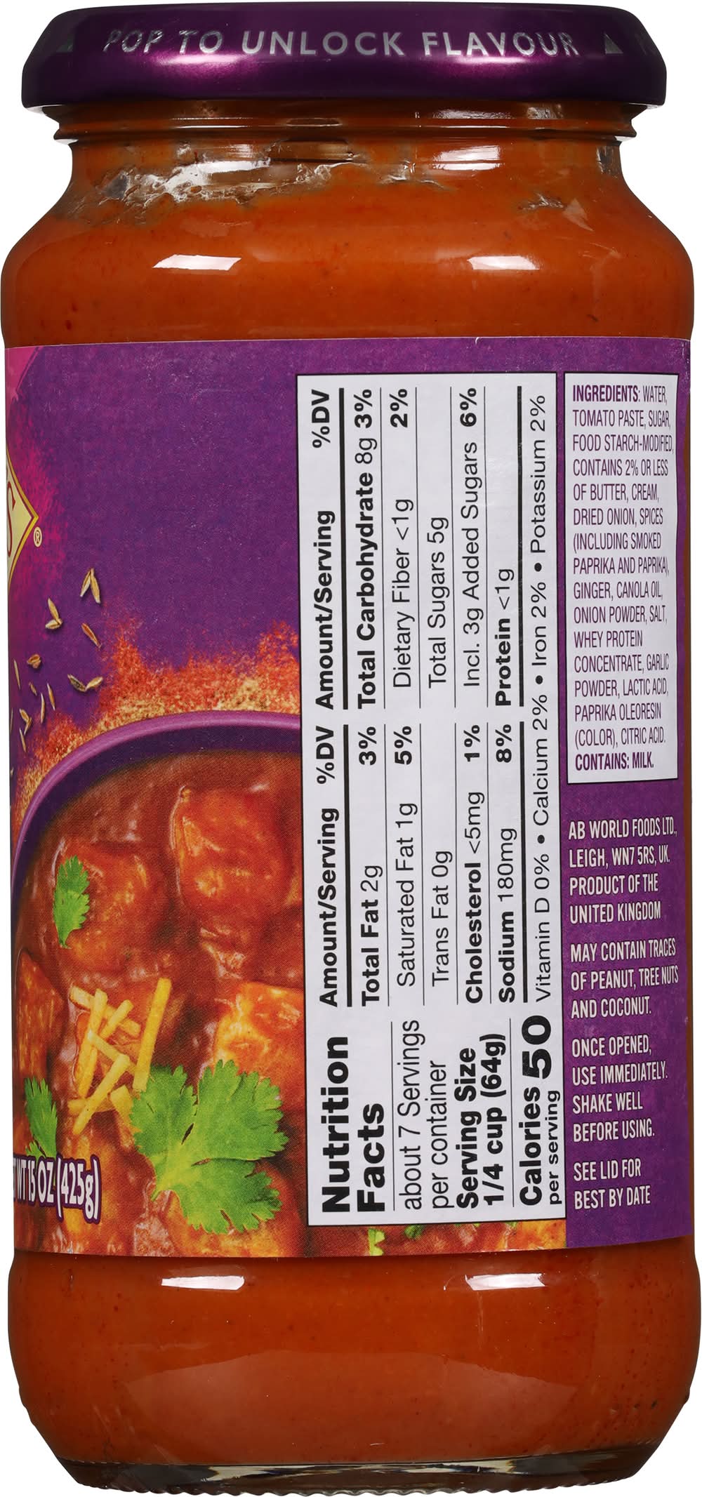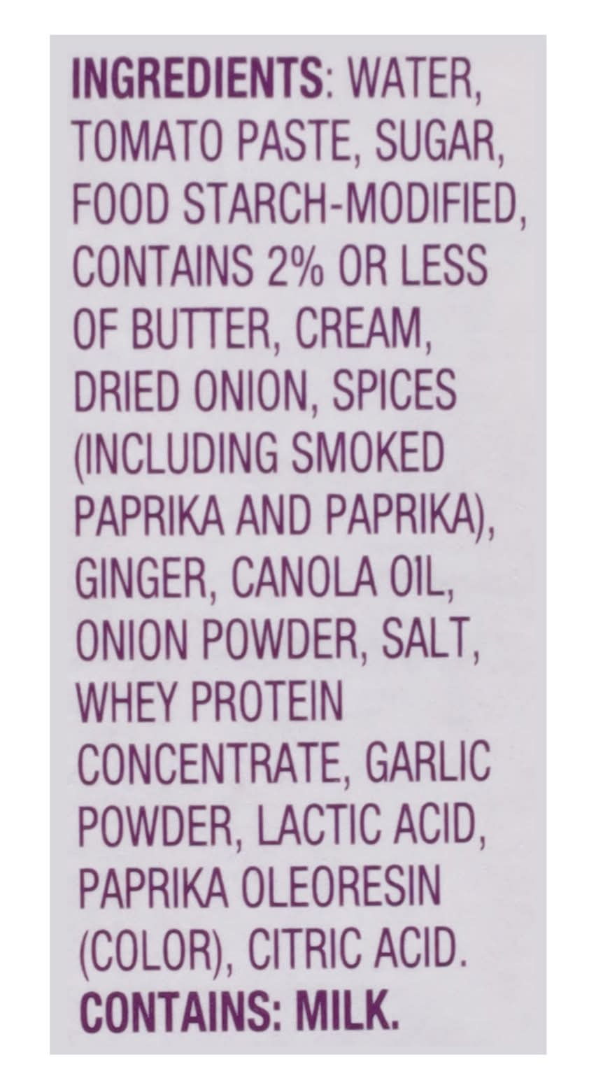 Ingredients: Water, Tomato Paste, Sugar, Food Starch-Modified, Contains 2% or Less of Butter, Cream, Dried Onion, Spices (Including Smoked Paprika and Paprika), Ginger, Canola Oil, Onion Powder, Salt, Whey Protein Concentrate, Garlic Powder, Lactic Acid, Paprika Oleoresin (Color), Citric Acid Contains: Milk, Peanuts, Tree Nuts, Tree Nuts, Coconuts