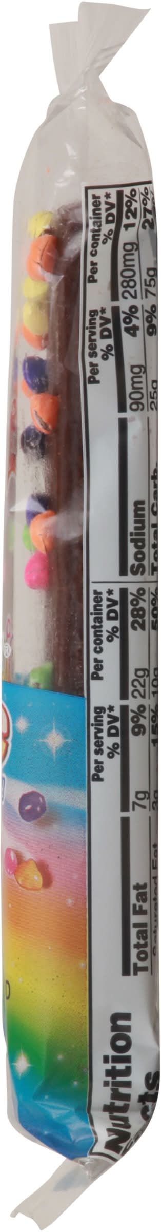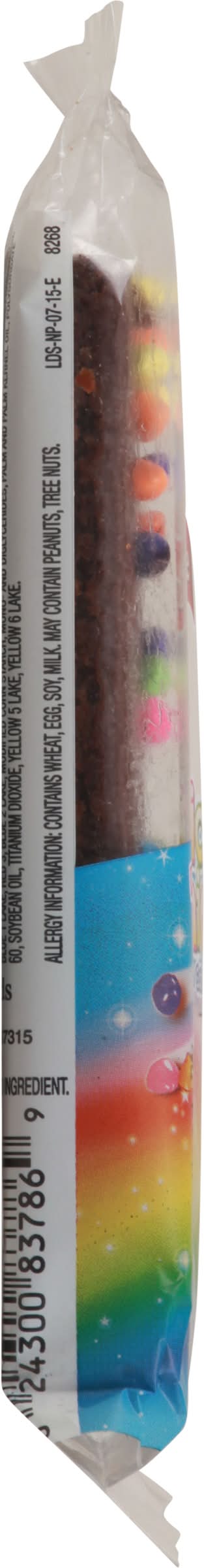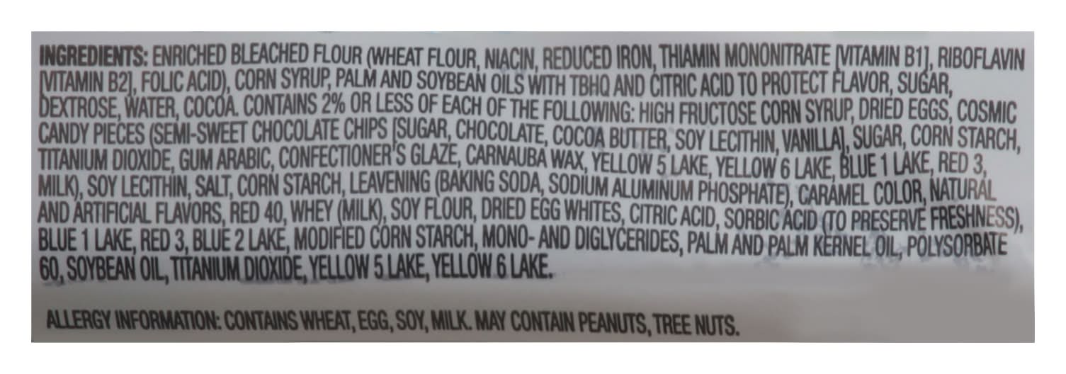 Ingredients: Enriched Bleached Flour (Wheat Flour Niacin Reduced Iron, Thiamin Mononitrate [Vitamin B1], Riboflavin [Vitamin B2], Folic Acid), Corn Syrup Palm and Soybean Oils with TBHQ and Citric Acid to Protect Flavor, Sugar, Dextrose, Water, Cocoa, Contains 2% or Less of Each of the Following: High Fructose Corn Syrup, Dried Eggs, Cosmic Candy Pieces (Semi-Sweet Chocolate Chips [Sugar, Chocolate, Cocoa Butter Soy Lecithin, Vanilla] Sugar, Corn Starch, Titanium Dioxide, Gum Arabic, Confectioner’s Glaze, Carnauba Wax, Yellow 5, Lake, Yellow 6 Lake, Blue 1 Lake, Red 3, Milk), Soy Lecithin, Salt, Corn Starch, Leavening (Baking Soda, Sodium Aluminum Phosphate), Caramel Color, Natural and Artificial Flavors, Red 40, Whey (Milk), Soy Flour, Dried Egg Whites, Citric Acid, Sorbic Acid (to Preserve Freshness), Blue 1 Lake, Red 3, Blue 2, Modified Corn Starch, Mono- and Diglycerides, Palm and Palm Kernel Oil, Polysorbate 60, Soybean Oil, Titanium Dioxide, Yellow 5 Lake, Yellow 6 Lake Contains: Wheat, Soybeans, Milk, Eggs