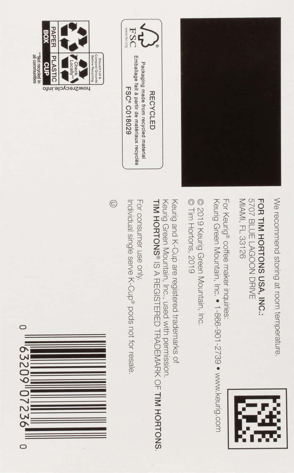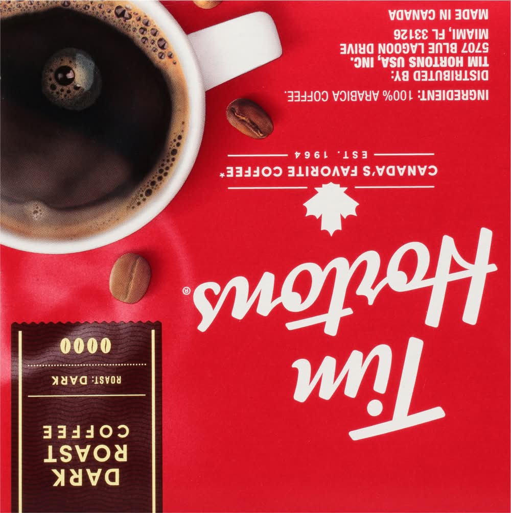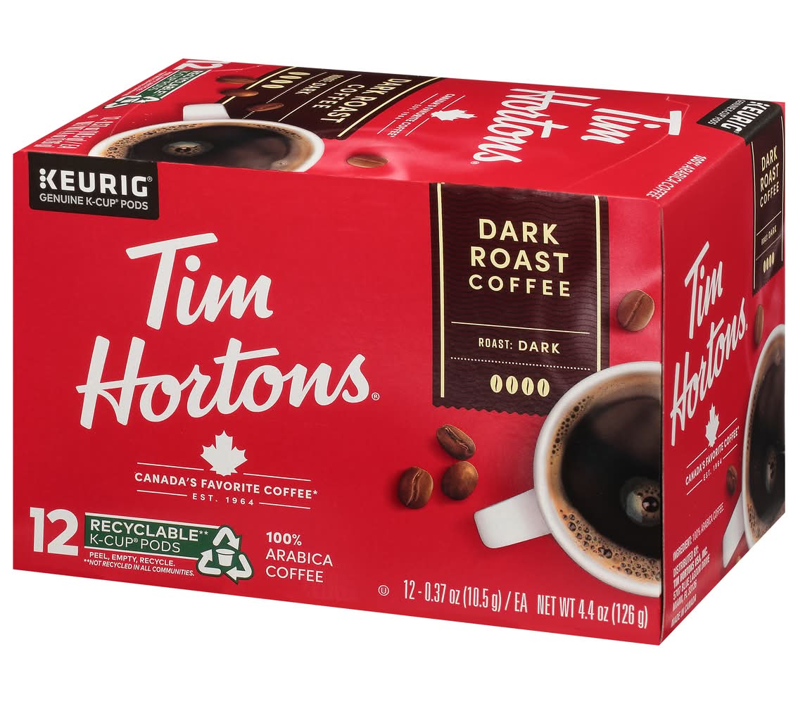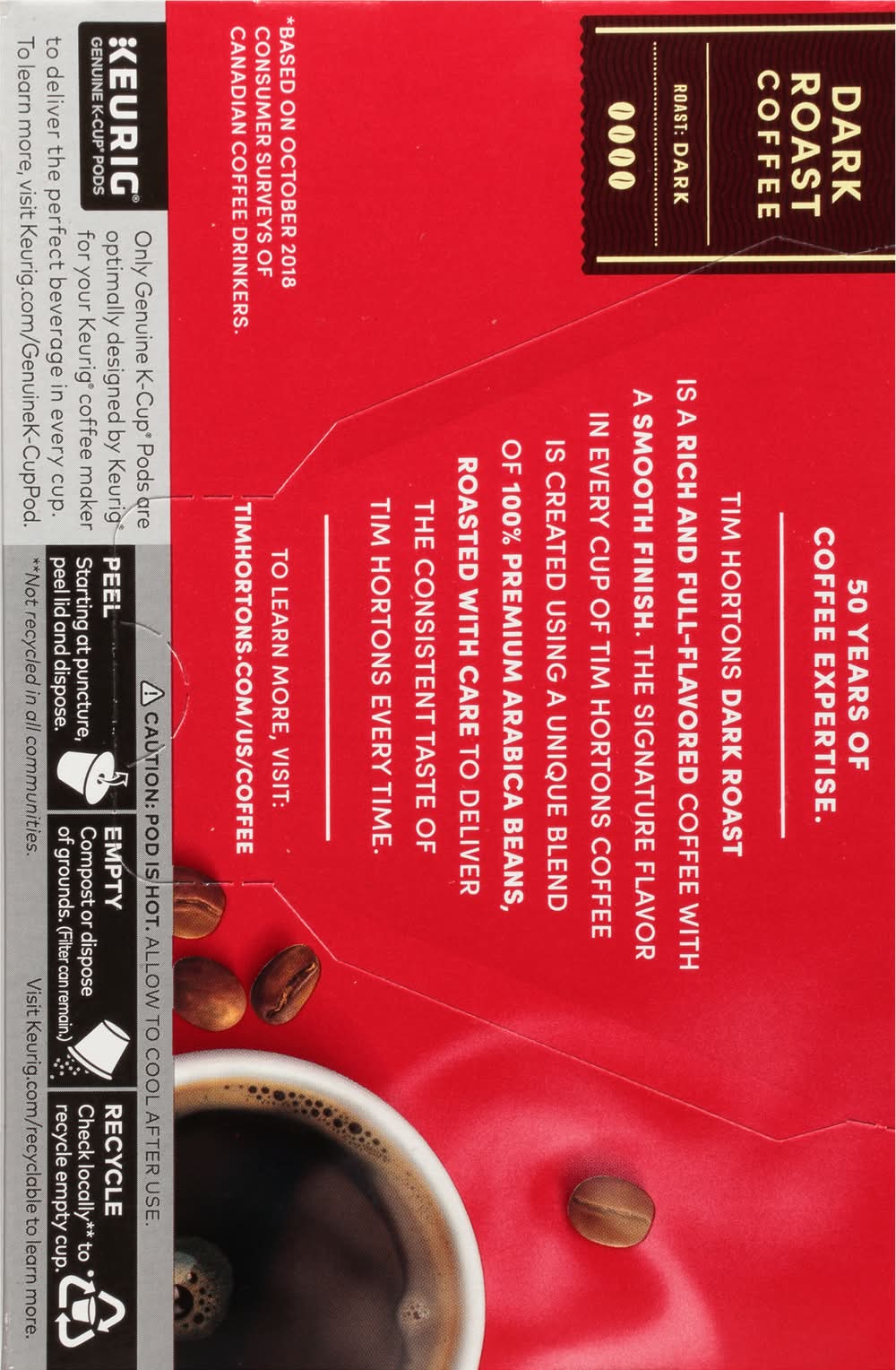 Coffee, Dark Roast, K-Cup Pods • Tim Hortons USA, Inc., 5707 Blue Lagoon Drive, Miami, FL, 33126 • Packaging: Reusable
