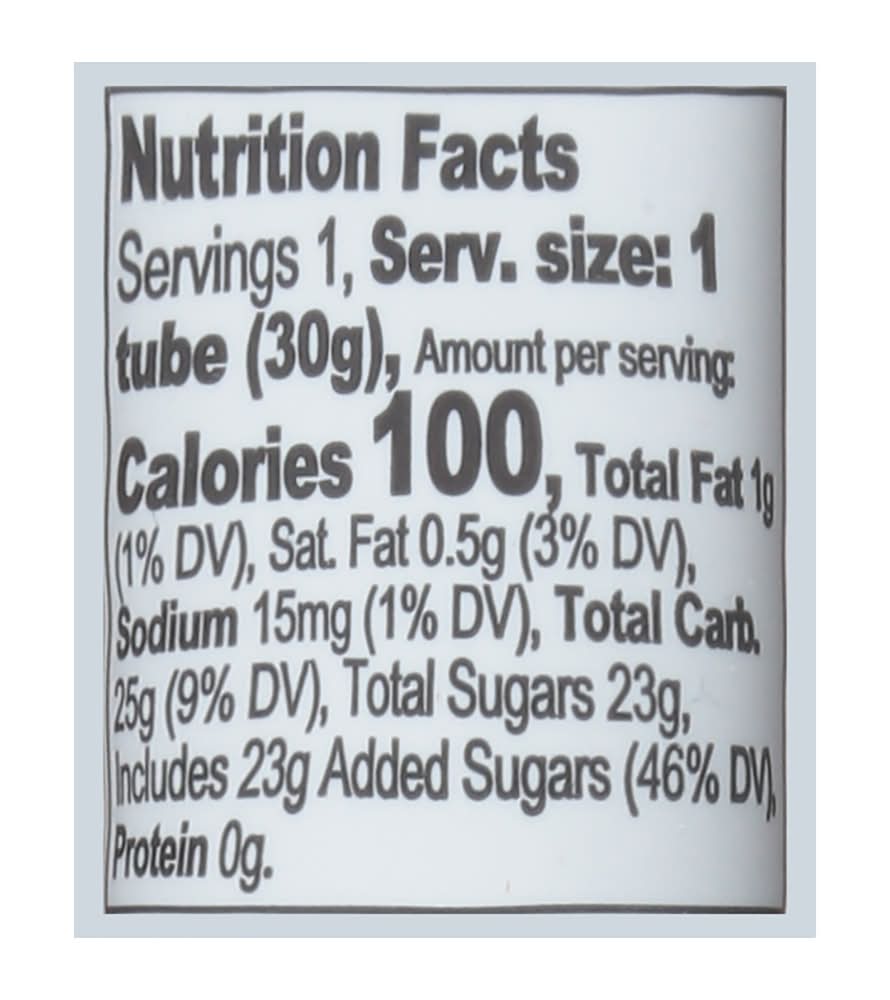 Ingredients: Sugar, Water, Corn Syrup Palm Oil, Invert Sugar, 2% or Less of: Titanium Dioxide (Color), Soy Lecithin, Red 40, Agar Gum, Blue 1, Citric Acid, Yellow 5, Natural and Artificial Flavor, Acetylated Monoglycerides, Locust Bean Gum, Potassium Sorbate and Sodium Benzoate (Preservatives) Contains: Soybeans, Eggs, Milk, Wheat, Tree Nuts