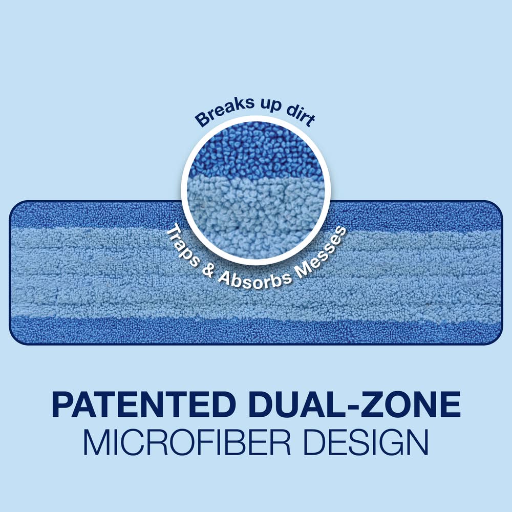 Designed for use with a specific family of mops, the Microfiber Cleaning Pad pack includes multiple cleaning pads that utilize dual zone cleaning action for efficient maintenance. The dark blue outer fibers effectively break up grime, while the inner light blue fibers trap and absorb dirt. Crafted from soft microfiber material, these pads are safe for various floor types, including hardwood, stone, tile, laminate, and LVT/LVP, without causing scratches or damage. Additionally, the pads are machine washable, allowing for repeated use. • Color: Blue • Size: 18.31x5.12 in