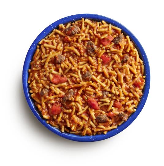 Mountain House Classic Spaghetti With Meat Sauce is a convenient and delicious meal option featuring tender spaghetti pasta and chunks of beef enveloped in a rich marinara sauce. This product is freeze-dried, a process that helps lock in nutrients and freshness while allowing the product to be stored without refrigeration. It is free from artificial preservatives, flavors, or colors. To prepare, simply add hot water directly to the pouch, making it an easy option with no cleanup necessary.