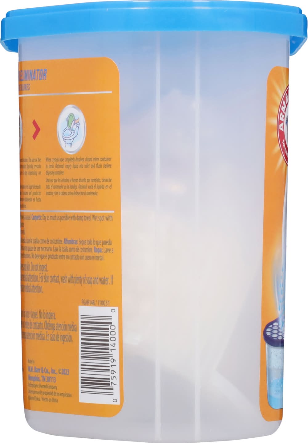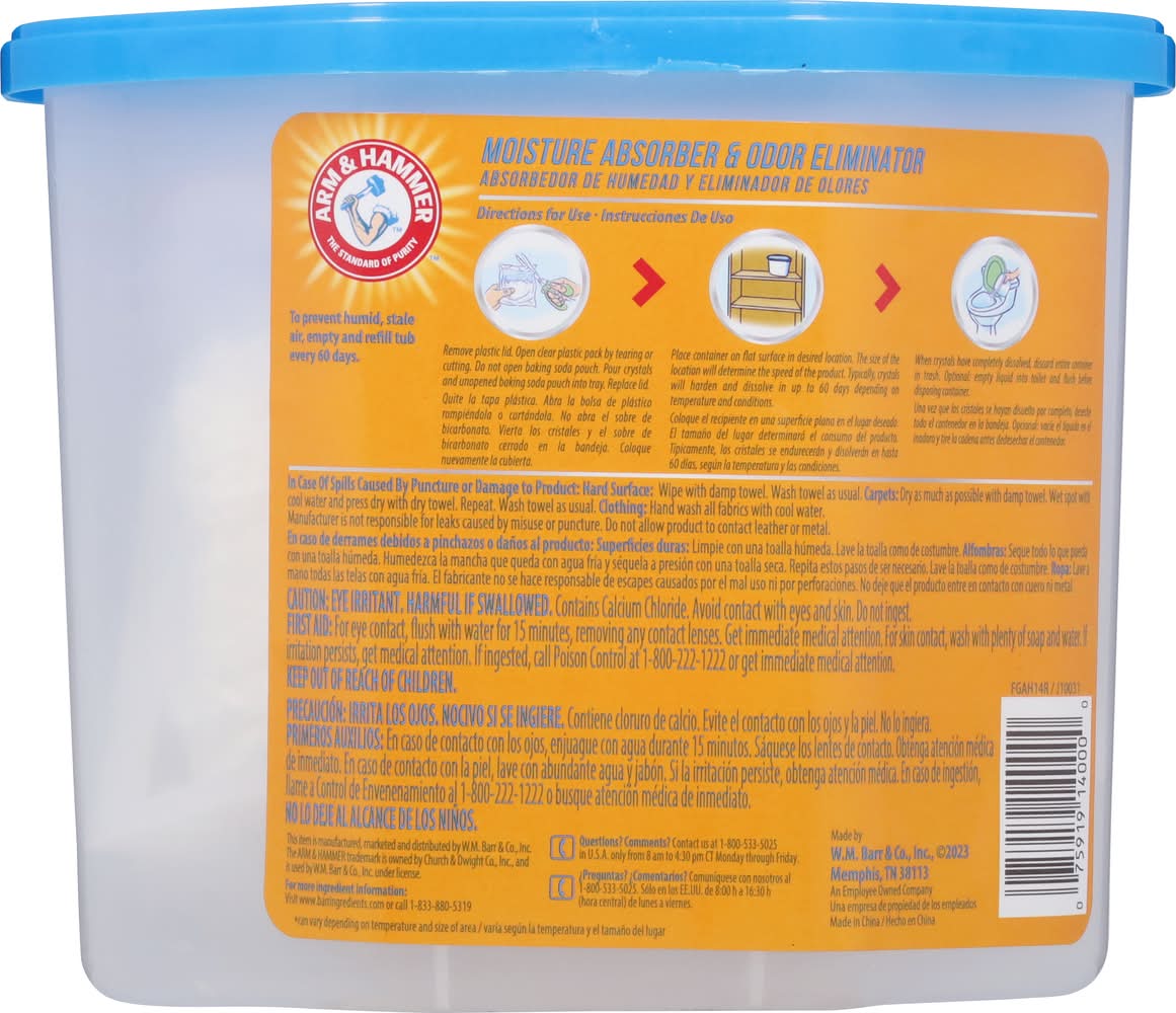 Directions for use: Directions for Use: Remove plastic lid. Open pack by tearing or cutting. Pour crystals and baking soda pouch (do not open baking soda pouch) into tray. Replace lid. Place container on flat surface in desired location. The size of the location determine the speed of the product. Typically crystals will harden and dissolve in up to 60 days depending on temperature and conditions. When crystals have completely dissolved, empty liquid into toilet and flush. Dispose of fragrance beads and Arm & Hammer socket in trash. Refill with Arm & hammer moisture absorber & odor eliminator refills. In case of spills caused by puncture or damage to product: Hard Surface: Wipe with damp towel. Wash towel as usual. Carpets: Dry as much as possible with damp towel. Wet spot with cool water and press dry with dry towel. Repeat. Wash towel as usual. Clothing; hand wash all fabrics with cool water. Manufacturer is not responsible for leaks caused by misuse or puncture. Do not allow product to contact leather or metal. - Directions: for Use: Remove plastic lid. Open pack by tearing or cutting. Pour crystals and baking soda pouch (do not open baking soda pouch) into tray. Replace lid. Place container on flat surface in desired location. The size of the location determine the speed of the product. Typically crystals will harden and dissolve in up to 60 days depending on temperature and conditions. When crystals have completely dissolved, empty liquid into toilet and flush. Dispose of fragrance beads and Arm & Hammer socket in trash. Refill with Arm & hammer moisture absorber & odor eliminator refills. In case of spills caused by puncture or damage to product: Hard Surface: Wipe with damp towel. Wash towel as usual. Carpets: Dry as much as possible with damp towel. Wet spot with cool water and press dry with dry towel. Repeat. Wash towel as usual. Clothing; hand wash all fabrics with cool water. Manufacturer is not responsible for leaks caused by misuse or puncture. Do not allow product to contact leather or metal. Keep out reach of children. Storage recommendation: Keep out reach of children.