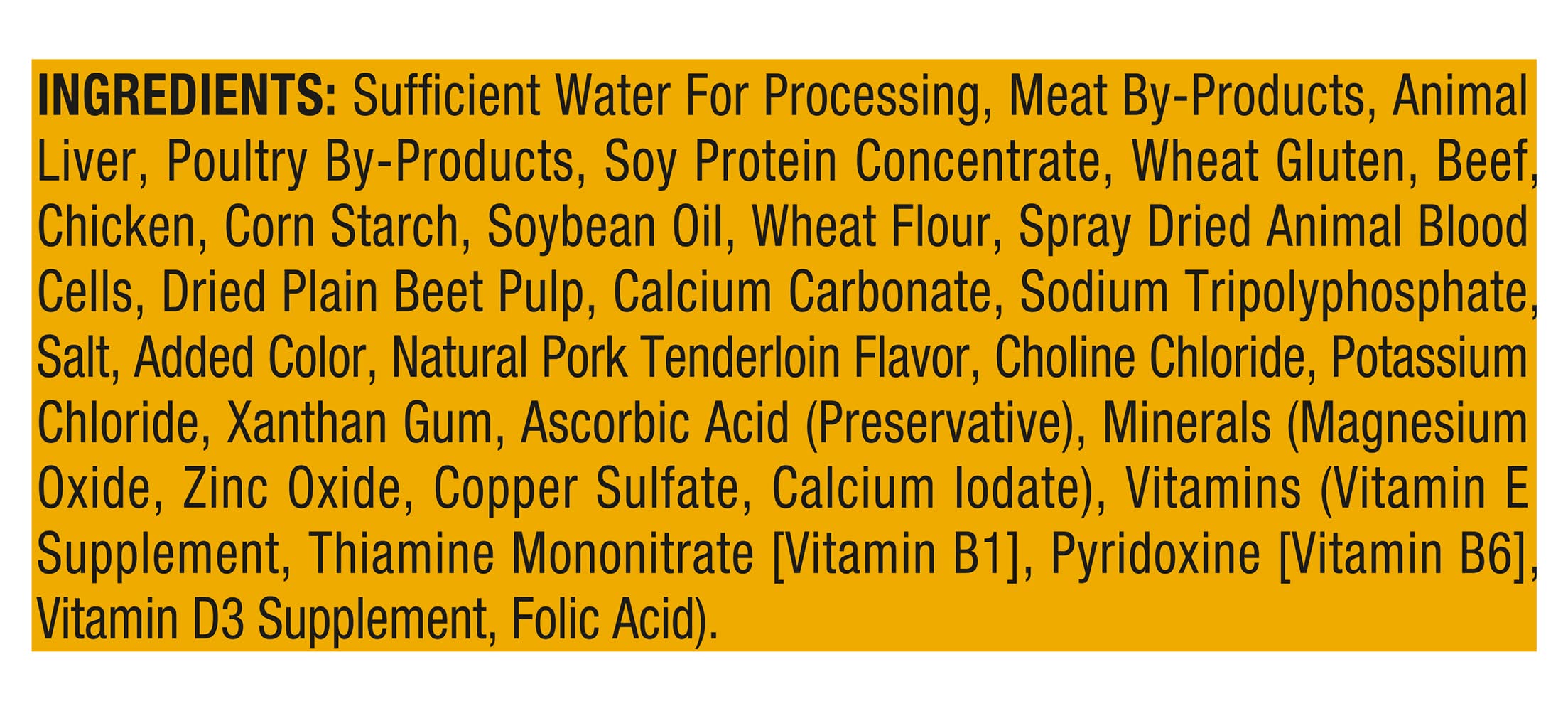 Ingredients: Sufficient Water for Processing, Meat By-Products, Animal Liver, Poultry By-Products, Soy Protein Concentrate, Wheat Gluten, Beef, Chicken, Corn Starch, Soybean Oil, Wheat Flour, Spray Dried Animal Blood Cells, Dried Plain Beet Pulp, Calcium Carbonate, Sodium Tripolyphosphate, Salt, Added Color, Natural Pork Tenderloin Flavor, Choline Chloride, Potassium Chloride, Xanthan Gum, Ascorbic Acid (Preservative), Minerals (Magnesium Oxide, Zinc Oxide, Copper Sulfate, Calcium Iodate), Vitamins (Vitamin E Supplement, Thiamine Mononitrate [Vitamin B1], Pyridoxine [Vitamin B6], Vitamin D3 Supplement, Folic Acid) Contains: Soybeans, Corn, Wheat, Gluten