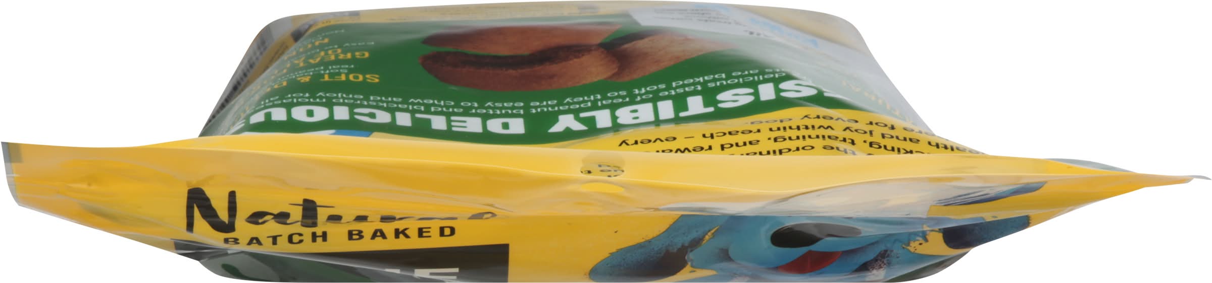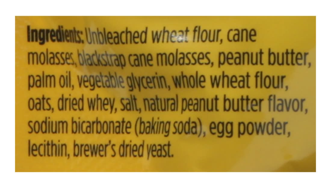 Ingredients: Unbleached Wheat Flour, Cane Molasses, Blackstrap Cane Molasses, Peanut Butter, Palm Oil, Vegetable Glycerin, Whole Wheat Flour, Oats, Dried Whey, Salt, Natural Peanut Butter Flavor, Sodium Bicarbonate (Baking Soda), Egg Powder, Lecithin, Brewer's Dried Yeast Contains: Wheat, Peanuts, Oat, Eggs