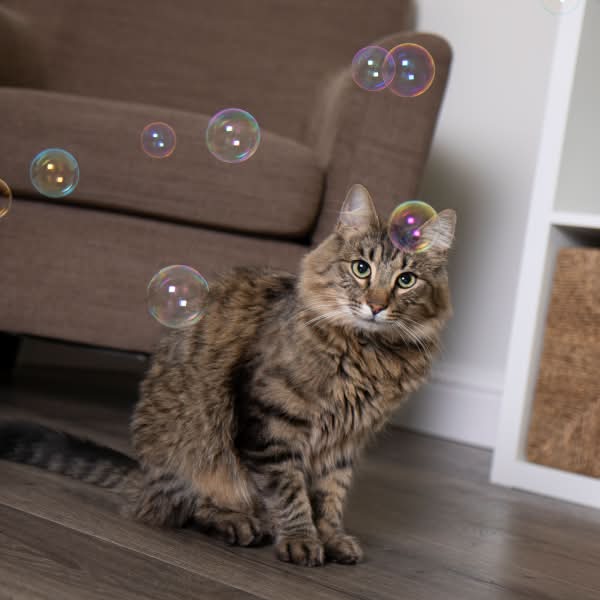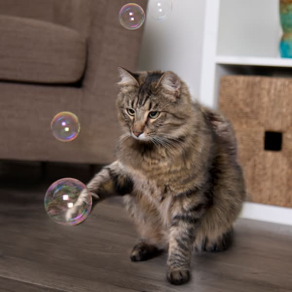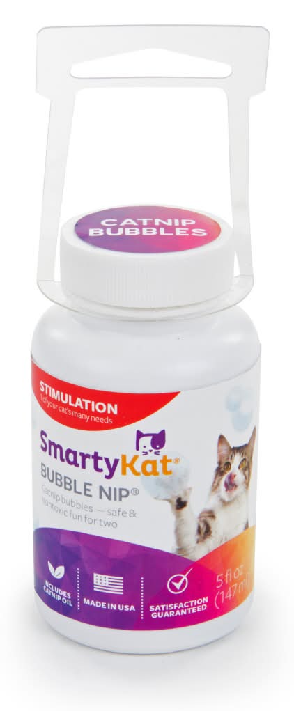 SmartyKat Bubble Nip is a catnip-infused bubble solution designed for interactive play between pets and their owners. The product includes a bubble applicator, allowing users to blow bubbles that cats can chase, swat, and enjoy. These bubbles are non-toxic and incorporate all-natural catnip, which may cause cats to react even to the areas where a bubble has popped. Typically, catnip stimulates a burst of energy in cats, followed by a calm, mellow period, enhancing the play experience. This product is crafted to enhance the bond between pet and pet parent through engaging, safe play.